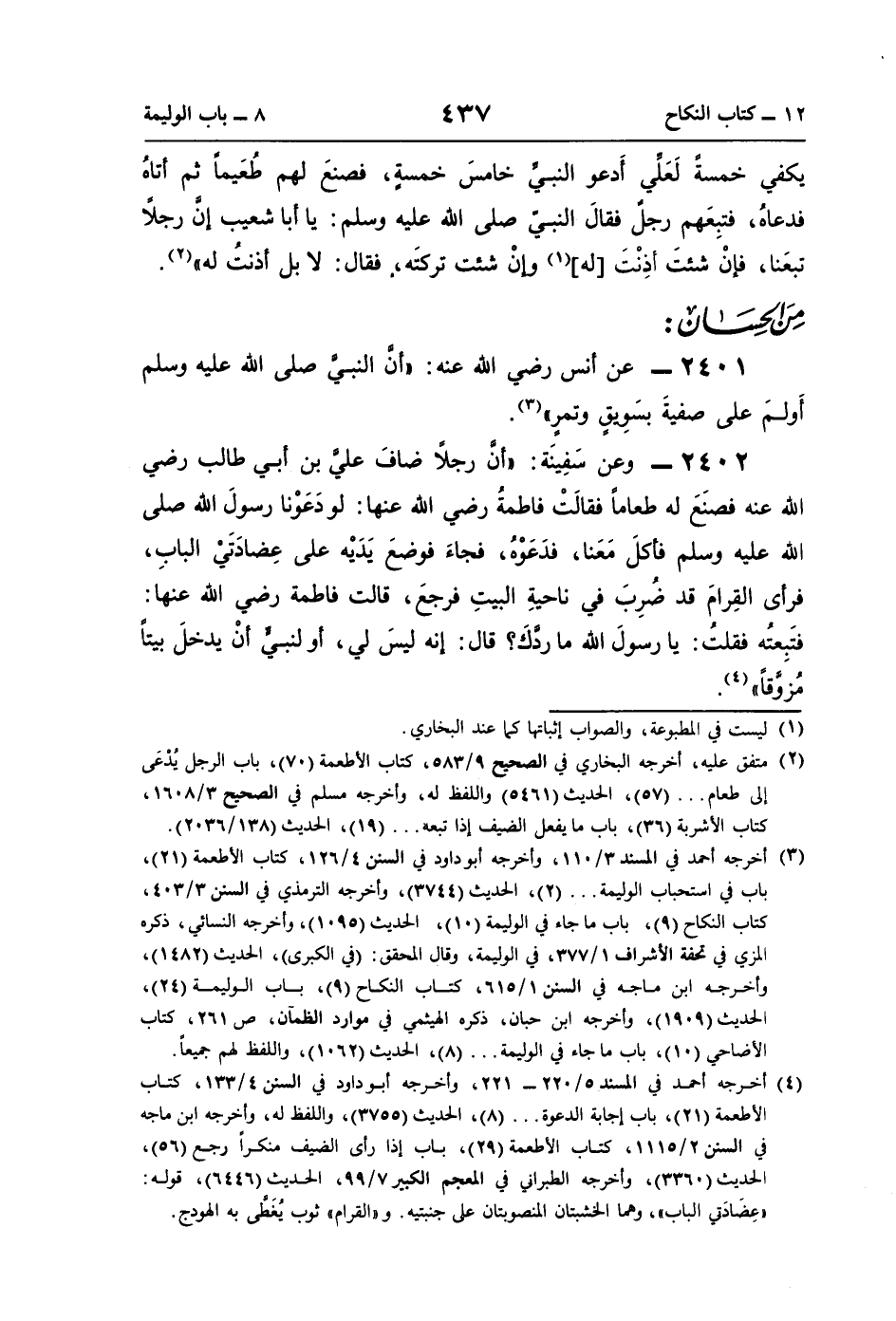 2401 - عن أنس رضي اللَّه عنه: "أنَّ النبيَّ صلى اللَّه عليه وسلم أَولمَ على صفيةَ بسَوِيقٍ وتمرٍ" (¬3).