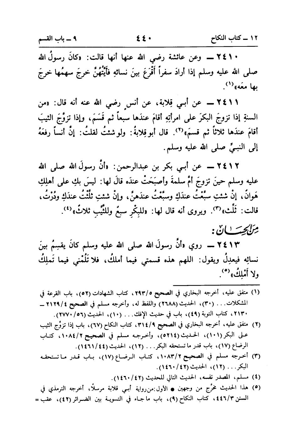 2412 - عن أبي بكر بن عبد الرحمن: "أنَّ رسولَ اللَّه صلى اللَّه عليه وسلم حينَ تزوجَ أمَّ سلمةَ وأصبَحَتْ عندَه قالَ لها: ليسَ بكِ على أهلِكِ هَوانٌ، إِنْ شئتِ سبَّعْتُ عندَكِ وسبَّعْتُ عندَهنَّ، وإنْ شئتِ ثَلَّثْتُ عندَكِ ودُرْتُ، قالت: ثَلِّث" (¬3). ويروى أنَّه قال لها: "للبِكْرِ سبعٌ وللثَّيِّبِ ثلاثٌ" (¬4).