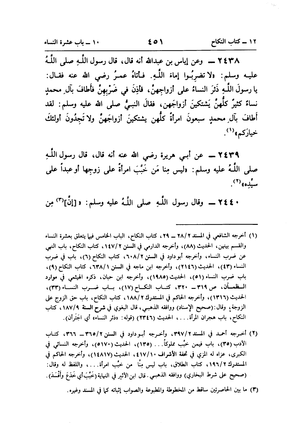 2438 - وعن إياس بن عبد اللَّه أنَّه قال، قال رسول اللَّهِ صلى اللَّهُ عليه وسلم: "لا تضرِبُوا إماءَ اللَّهِ. فأتاهُ عمرُ رضي اللَّه عنه فقال: يا رسولَ اللَّهِ ذَئرَ النساءُ على أزواجِهنَّ، فأذِنَ في ضَرْبِهِنَّ فأطافَ بآلِ محمدٍ نساءٌ كثيرٌ كلُّهنَّ يَشتكينَ أزواجَهن، فقالَ النبيُّ صلى اللَّه عليه وسلم: لقد أَطافَ بآلِ محمدٍ سبعونَ امرأةً كلُّهن يشتكينَ أزواجَهنَّ ولا تَجِدُونَ أولئكَ خيارَكم" (¬1).