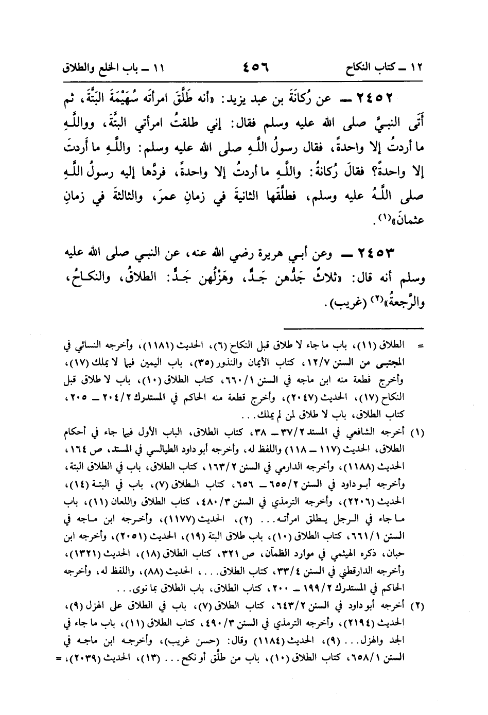 2453 - وعن أبي هريرة رضي اللَّه عنه، عن النَّبيّ صلى اللَّه عليه وسلم أنَّه قال: "ثلاثٌ جَدُّهنَّ جَدٌّ، وهَزْلُهن جَدٌّ: الطلاقُ، والنكاحُ، والرَّجعةُ" (¬2) (غريب).