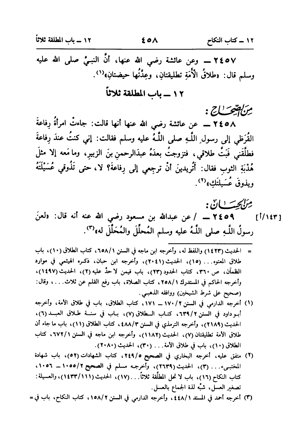 2459 - عن عبد اللَّه بن مسعود رضي اللَّه عنه أنَّه قال: "لعنَ رسولُ اللَّهِ صلى اللَّهُ عليه وسلم المُحلِّل والمُحَلَّل له" (¬3).