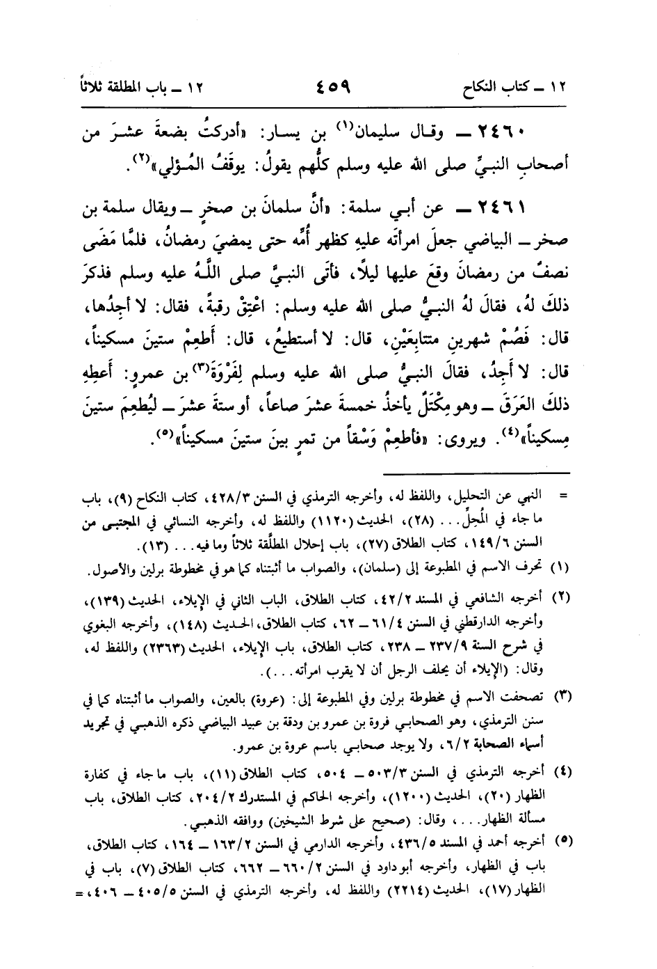 2460 - وقال سليمان (¬1) بن يسار: "أدركتُ بضعةَ عشرَ من أصحابِ النَّبيِّ صلى اللَّه عليه وسلم كلُّهم يقولُ: يوقَفُ المُؤلي" (¬2).