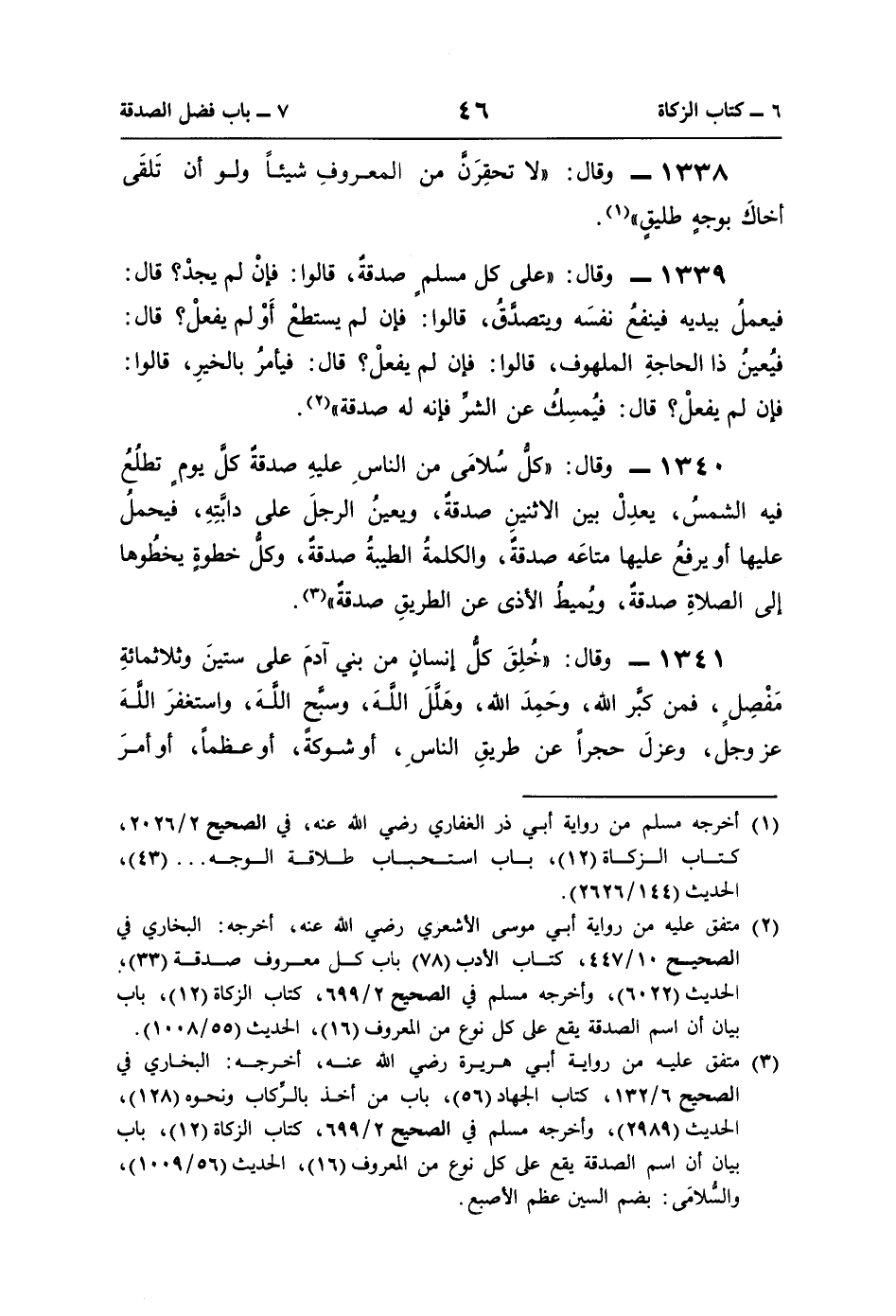 (¬2) متفق عليه من رواية أبي موسى الأشعري رضي اللَّه عنه، أخرجه: البخاري في الصحيح 10/ 447، كتاب الأدب (78) باب كل معروف صدقة (33)؛ الحديث (6022)، وأخرجه مسلم في الصحيح 2/ 699، كتاب الزكاة (12)، باب بيان أن اسم الصدقة يقع على كل نوع من المعروف (16)، الحديث (55/ 1008).