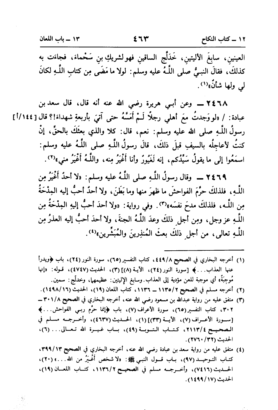 (¬4) متفق عليه من رواية سعد بن عبادة رضي اللَّه عنه، أخرجه البخاري في الصحيح 13/ 399، كتاب التوحيد (97)، باب قول النبي -صلى اللَّه عليه وسلم-: "لا شخص أَغْيَرُ من اللَّه. . . " (20)، الحديث (7416)، وأخرجه مسلم في الصحيح 2/ 1136، كتاب اللعان (19)، الحديث (17/ 1499).