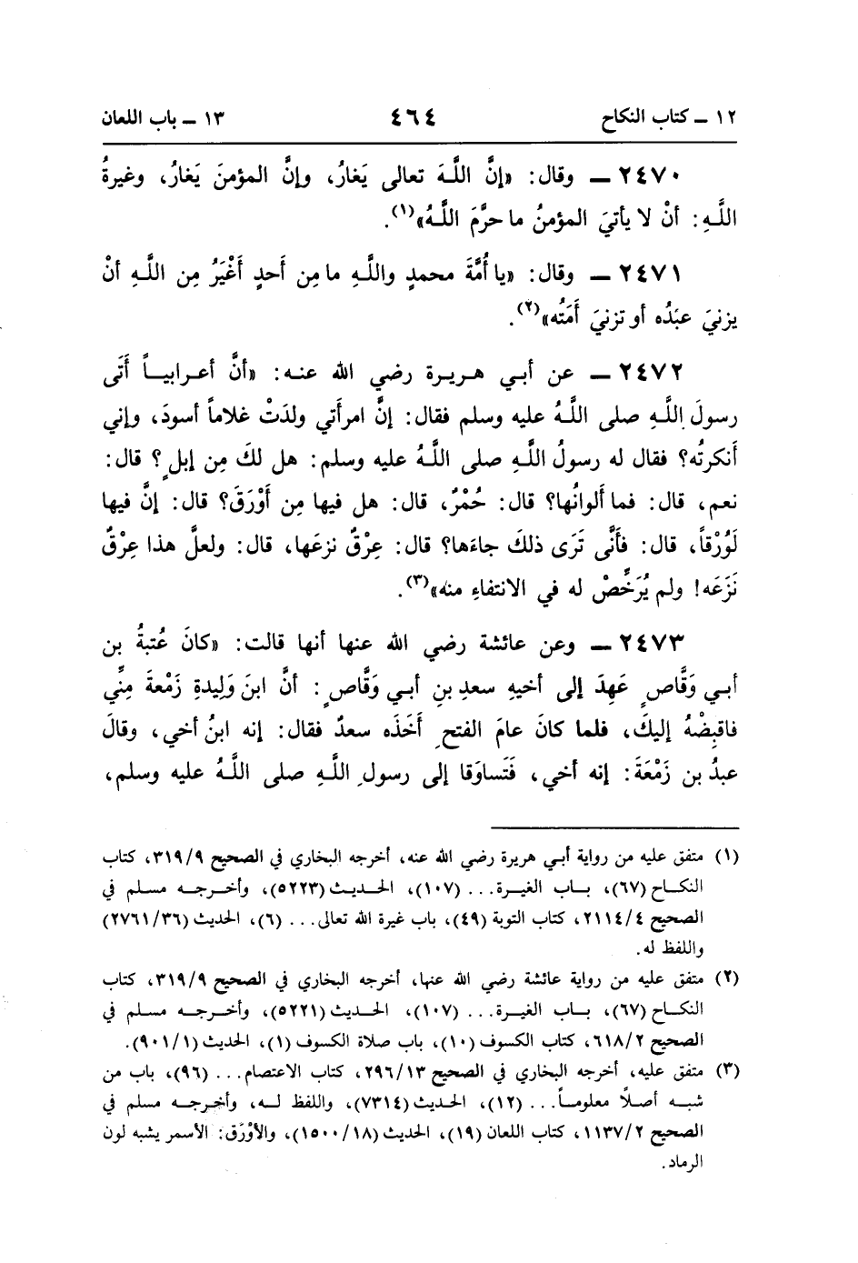 2472 - عن أبي هريرة رضي اللَّه عنه: "أنَّ أعرابيًّا أَتَى رسولَ اللَّهِ صلى اللَّهُ عليه وسلم فقال: إنَّ امرأَتي ولدَتْ غلامًا أسودَ، وإني أَنكرتُه؟ فقال له رسولُ اللَّهِ صلى اللَّهُ عليه وسلم: هل لكَ مِن إبلٍ؟ قال: نعم، قال: فما أَلوانُها؟ قال: حُمْرٌ، قال: هل فيها مِن أَوْرَقَ؟ قال: إنَّ فيها لَوُرْقًا، قال: فأَنَّى تَرَى ذلكَ جاءَها؟ قال: عِرْقٌ نزعَها، قال: ولعلَّ هذا عِرْقٌ نَزَعَه! ولم يُرَخِّصْ له في الانتفاءِ منه" (¬3).