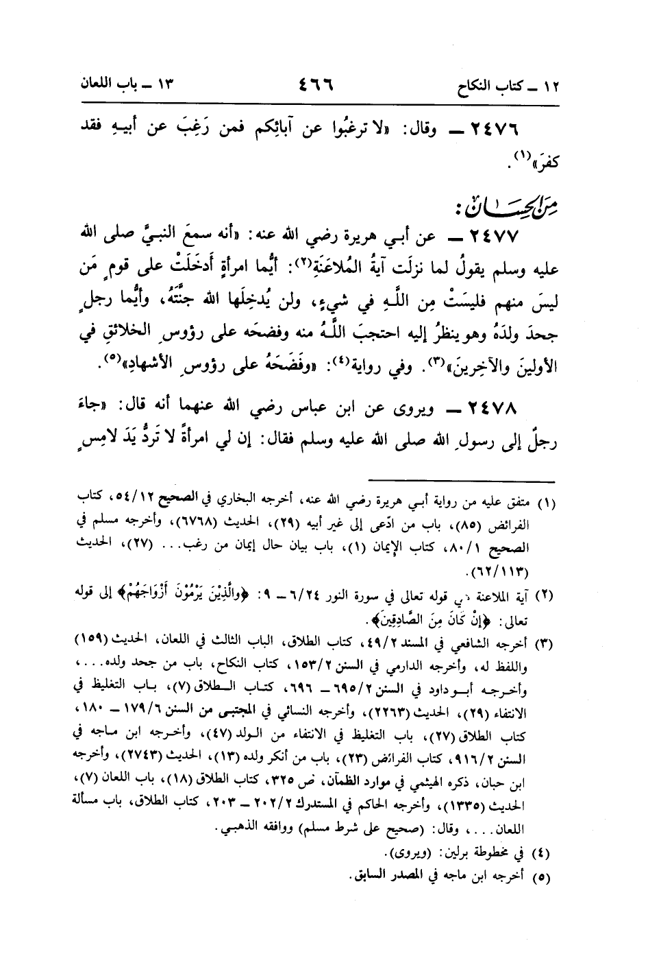 2477 - عن أبي هريرة رضي اللَّه عنه: "أنَّه سمعَ النبيَّ صلى اللَّه عليه وسلم يقولُ لما نزلَت آيةُ المُلاعَنَةِ (¬2): أيُّما امرأةٍ أَدخَلَتْ على قومٍ مَن ليسَ منهم فليسَتْ مِن اللَّهِ في شيءٍ، ولن يُدخِلَها اللَّه جنَّتَهُ، وأيُّما رجلٍ جحدَ ولدَهُ وهو ينظرُ إليه احتجبَ اللَّهُ منه وفضحَه على رؤوسِ الخلائقِ في الأولينَ والآخِرينَ" (¬3). وفي رواية (¬4): "وفَضَحَهُ على رؤوسِ الأشهادِ" (¬5).