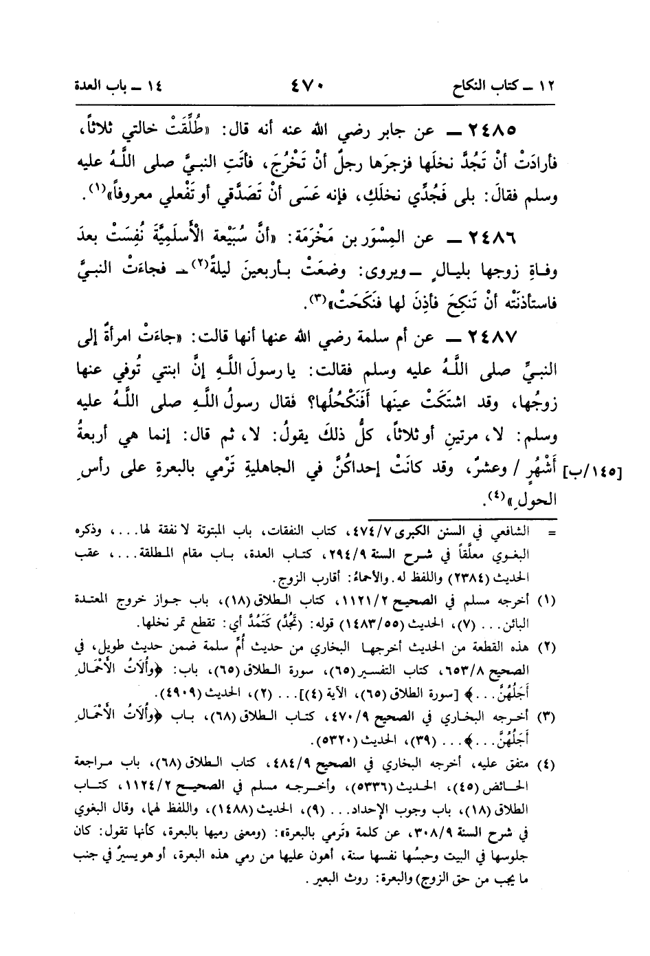 2486 - عن المِسْوَر بن مَخْرَمَة: "أنَّ سُبَيْعة الْأَسلَمِيَّةَ نُفِسَتْ بعدَ وفاةِ زوجها بليالٍ -ويروى: وضعَتْ بأربعينَ ليلةً (¬2) - فجاءَتْ النبيَّ فاستأذنَتْه أنْ تَنكِحَ فأذِنَ لها فنَكَحَتْ" (¬3).