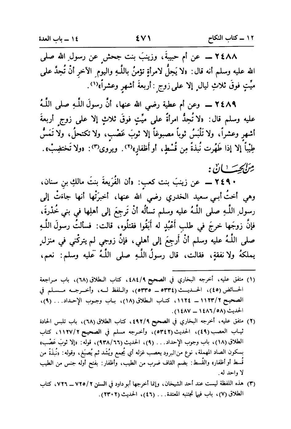 (¬3) هذه اللفظة ليست عند أحد الشيخان، وإنما أخرجها أبو داود في السنن 2/ 725 - 726، كتاب الطلاق (7)، باب فيما تجتنبه المعتدة. . . (46)، الحديث (2302).