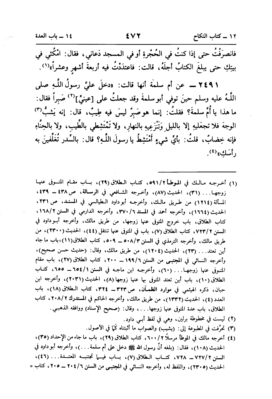 (¬4) أخرجه مالك في الموطأ مرسلًا 2/ 600، كتاب الطلاق (29)، باب ما جاء من الإحداد (35)، الحديث (108)، فقال: (بلغه أنَّ رسول اللَّه -صلى اللَّه عليه وسلم- دخل على أم سلمة. . .)، وأخرجه أبو داود في السنن 2/ 727 - 728، كتاب الطلاق (7)، باب فيما تجتنبه المعتدة. . . (46)، الحديث (2305)، واللفظ له، وأخرجه النسائي في المجتبى من السنن 6/ 204 - 205، كتاب =