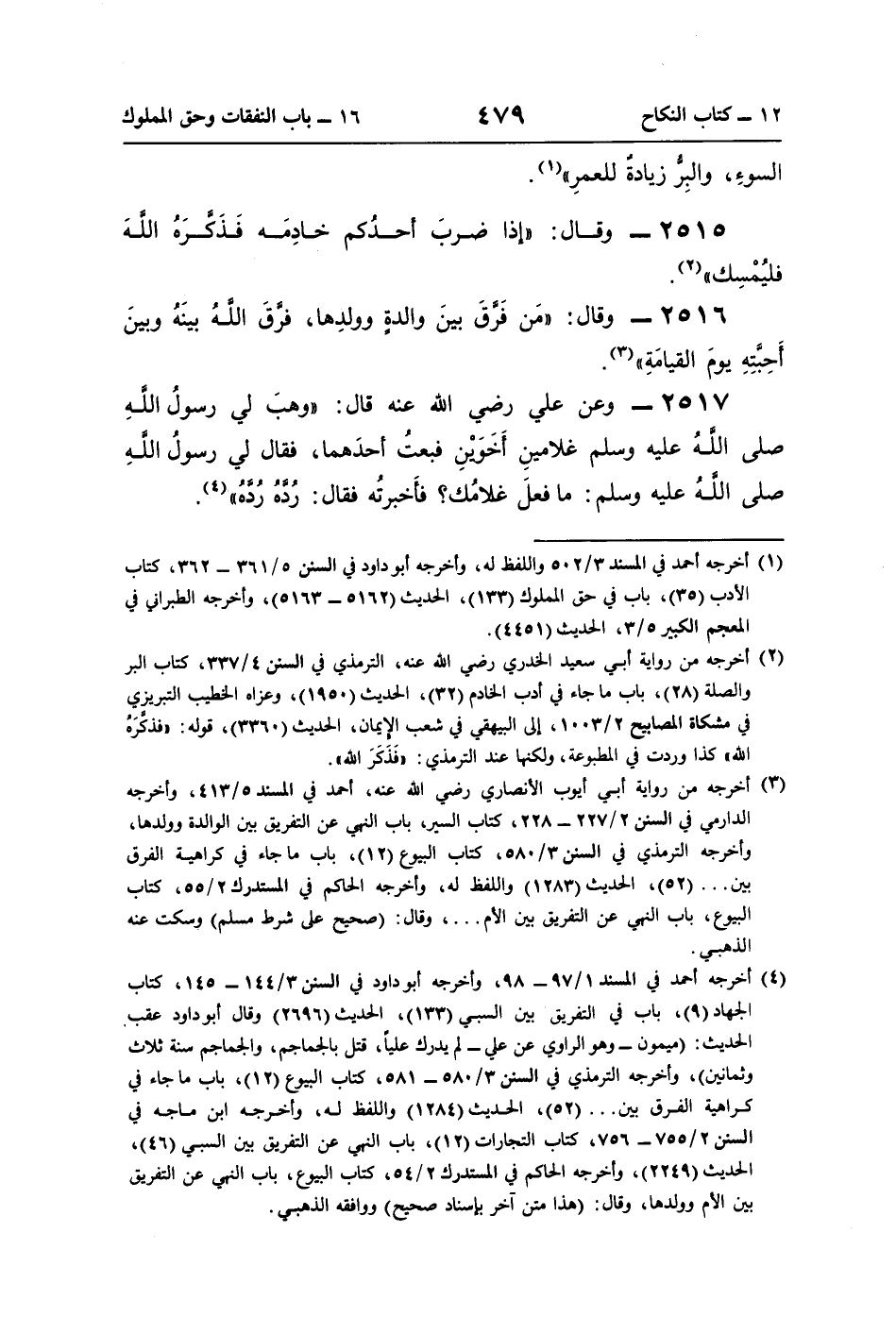 2517 - وعن علي رضي اللَّه عنه قال: "وهبَ لي رسولُ اللَّهِ صلى اللَّهُ عليه وسلم غلامينِ أَخَوينِ فبعتُ أحدَهما، فقال لي رسولُ اللَّهِ صلى اللَّهُ عليه وسلم: ما فعلَ غلامُك؟ فأَخبرتُه فقال: رُدَّهُ رُدَّهُ" (¬4).