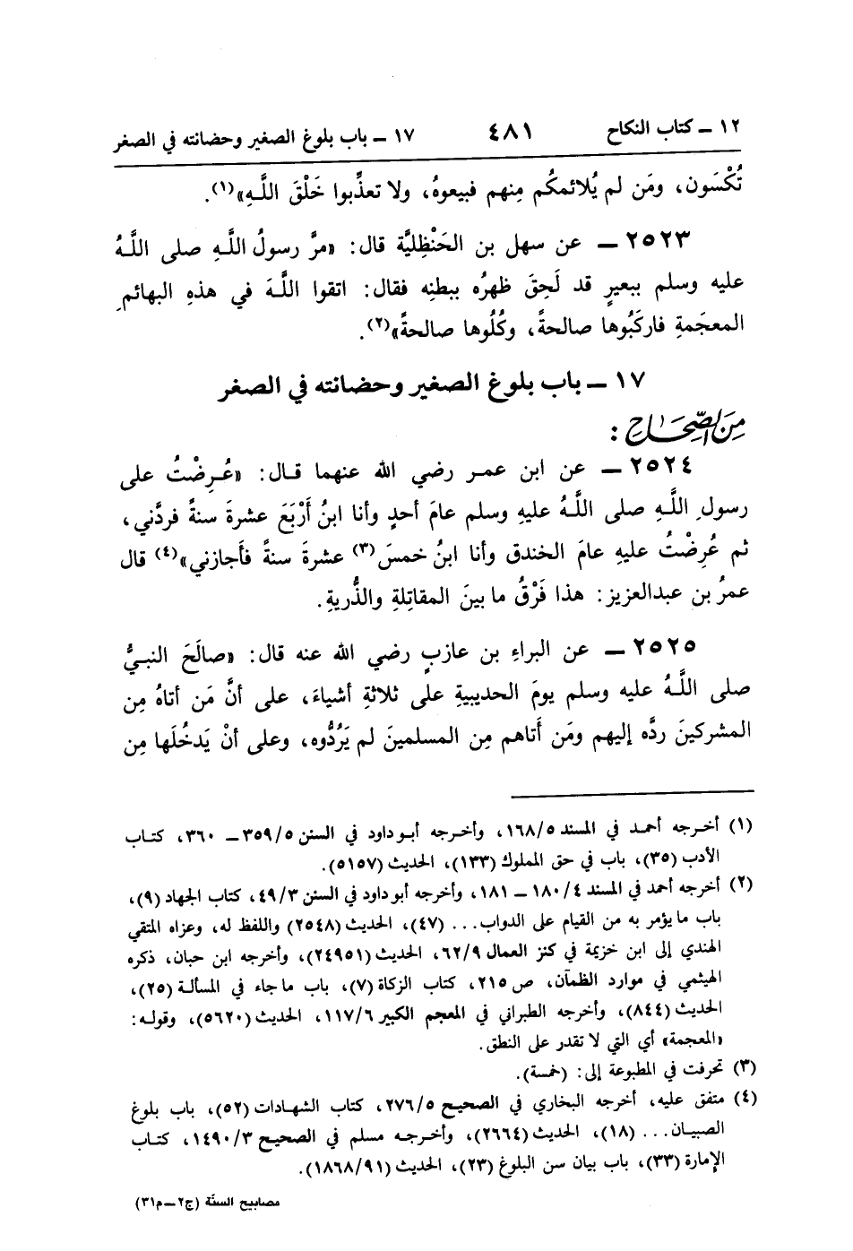 2524 - عن ابن عمر رضي اللَّه عنهما قال: "عُرِضْتُ على رسولِ اللَّهِ صلى اللَّهُ عليهِ وسلم عامَ أحدٍ وأنا ابنُ أَرْبَعَ عشرةَ سنةً فردَّني، ثم عُرِضْتُ عليهِ عامَ الخندق وأنا ابنُ خمسَ (¬3) عشرةَ سنةً فأَجازني" (¬4) قال عمرُ بن عبد العزيز: هذا فَرْقُ ما بينَ المقاتِلةِ والذُّريةِ.