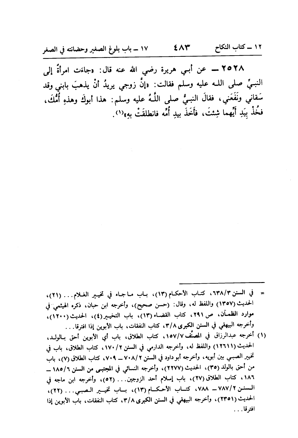 2528 - عن أبي هريرة رضي اللَّه عنه قال: "جاءَت امرأةٌ إلى النَّبيِّ صلى اللَّه عليه وسلم فقالت: "إنَّ زوجي يريدُ أنْ يذهبَ بابني وقد سَقاني ونَفَعَني، فقالَ النبيُّ صلى اللَّهُ عليه وسلم: هذا أبوكَ وهذهِ أُمُّكَ، فخُذْ بِيَدِ أَيِّهما شِئتَ، فأَخَذَ بيدِ أُمِّه فانطلقَتْ بهِ" (¬1).