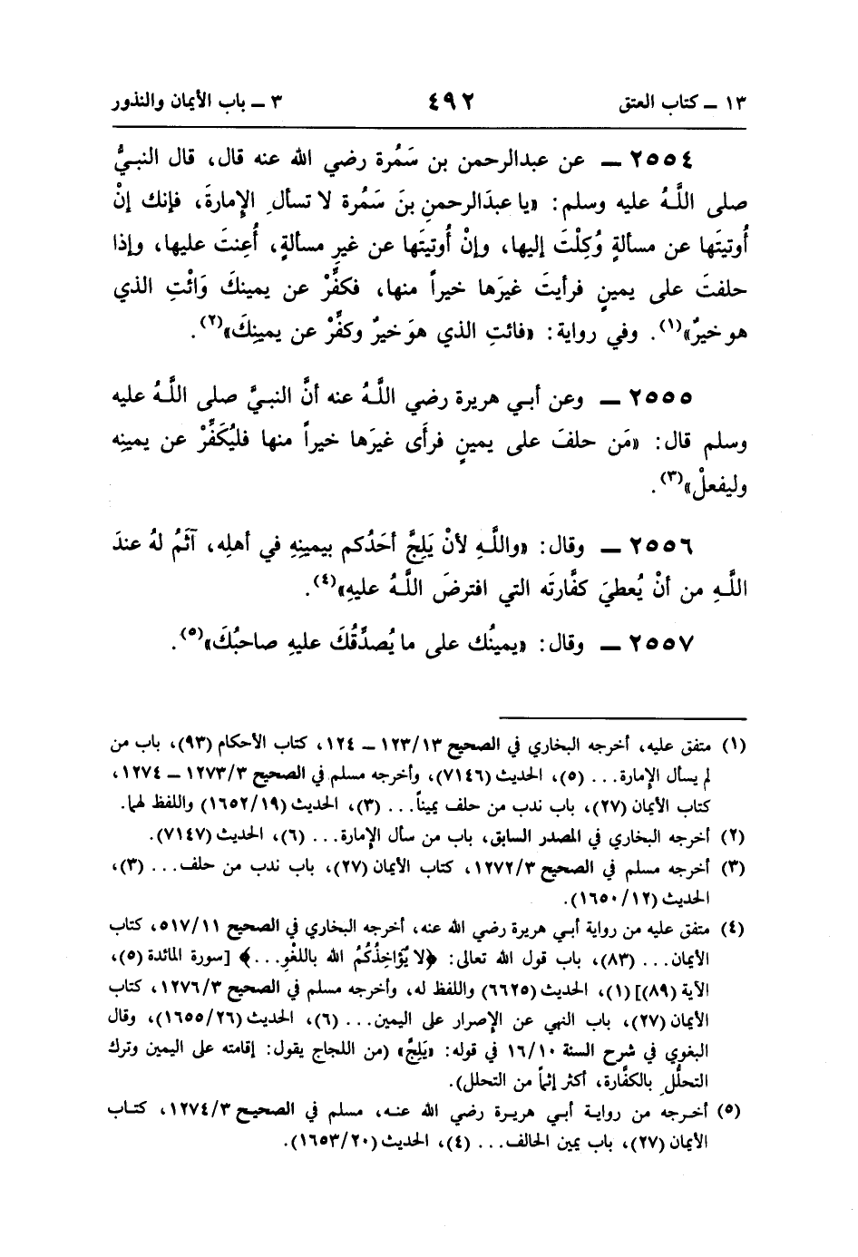 2554 - عن عبد الرحمن بن سَمُرة رضي اللَّه عنه قال، قال النبيُّ صلى اللَّهُ عليه وسلم: "يا عبدَ الرحمنِ بنَ سَمُرة لا تسألِ الإِمارةَ، فإنك إنْ أُوتيتَها عن مسألةٍ وُكِلْتَ إليها، وإنْ أُوتيتَها عن غير مسألةٍ، أُعِنتَ عليها، وإذا حلفتَ على يمينٍ فرأيتَ غيرَها خيرًا منها، فكفِّرْ عن يمينكَ وَائْتِ الذي هو خيرٌ" (¬1). وفي رواية: "فائتِ الذي هوَ خيرٌ وكفِّرْ عن يمينِكَ" (¬2).
