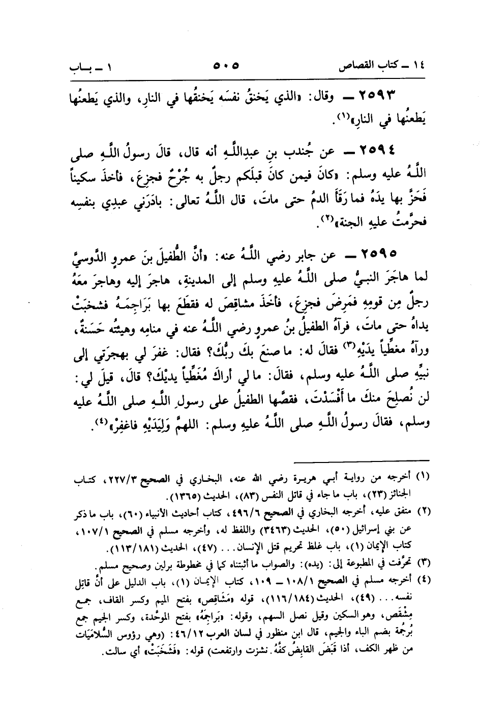 (¬4) أخرجه مسلم في الصحيح 1/ 108 - 109، كتاب الإِيمان (1)، باب الدليل على أنَّ قاتِل نفسه. . . (49)، الحديث (184/ 116)، قوله "مَشَاقِص" بفتح الميم وكسر القاف، جمع مِشْقَص، وهو السكين وقيل نصل السهم، وقوله: "بَراجِمَهُ" بفتح الموحَّدة، وكسر الجيم جمع بُرجُمة بضم الباء والجيم، قال ابن منظور في لسان العرب 12/ 46: (وهي رؤوس السُّلامَيَات من ظهر الكف، أذا قَبَضَ القابِضُ كفَّهُ. نشزت وارتفعت) قوله: "فَشَخَبَتْ" أي سالت.