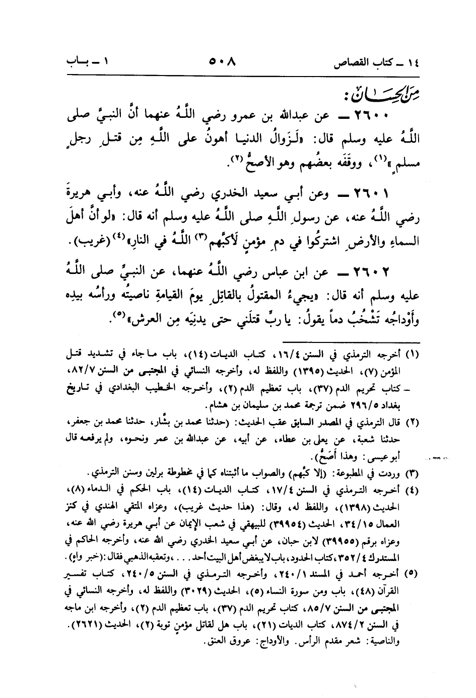 2600 - عن عبد اللَّه بن عمرو رضي اللَّهُ عنهما أنَّ النبيَّ صلى اللَّهُ عليه وسلم قال: "لَزَوالُ الدنيا أهونُ على اللَّهِ مِن قتلِ رجلٍ مسلمٍ" (¬1)، ووقَفَه بعضُهم وهو الأصحُّ (¬2).