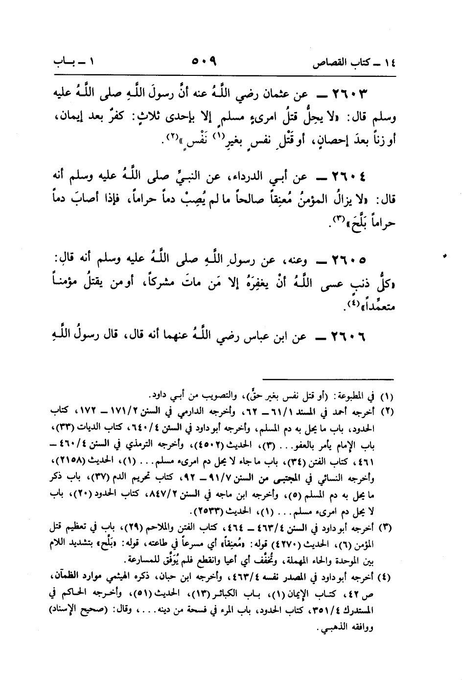 2603 - عن عثمان رضي اللَّهُ عنه أن رسولَ اللَّهِ صلى اللَّهُ عليه وسلم قال: "لا يحِلُّ قتلُ امرئٍ مسلم إلّا بإحدى ثلاثٍ: كفرٌ بعد إيمان، أو زنًا بعدَ إحصانٍ، أو قَتْلِ نفسٍ بغيرِ (¬1) نَفْسٍ" (¬2).