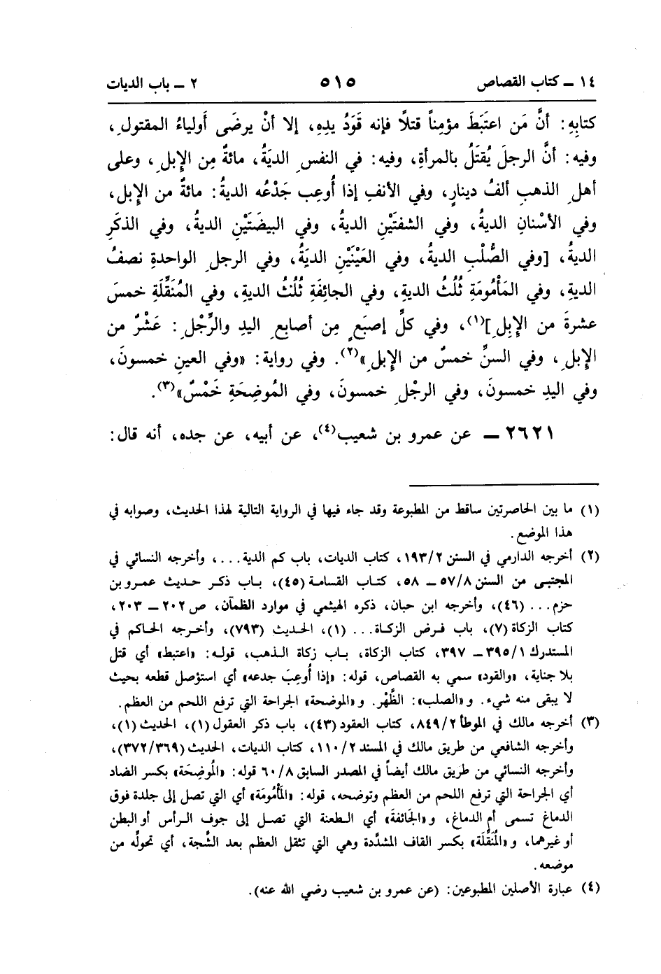 (¬2) أخرجه الدارمي في السنن 2/ 193، كتاب الديات، باب كم الدية. . .، وأخرجه النسائي في المجتبى من السنن 8/ 57 - 58، كتاب القسامة (45)، باب ذكر حديث عمرو بن حزم. . . (46)، وأخرجه ابن حبان، ذكره الهيثمي في موارد الظمآن، ص 202 - 203، كتاب الزكاة (7)، باب فرض الزكاة. . . (1)، الحديث (793)، وأخرجه الحاكم في المستدرك 1/ 395 - 397، كتاب الزكاة، باب زكاة الذهب، قوله: "اعتبط" أي قتل بلا جناية، "والقود" سمي به القصاص، قوله: "إذا أُوعِبَ جدعه" أي استؤصل قطعه بحيث لا يبقى منه شيء. و"الصلب": الظَّهْر. و"الموضحة" الجراحة التي ترفع اللحم من العظم.