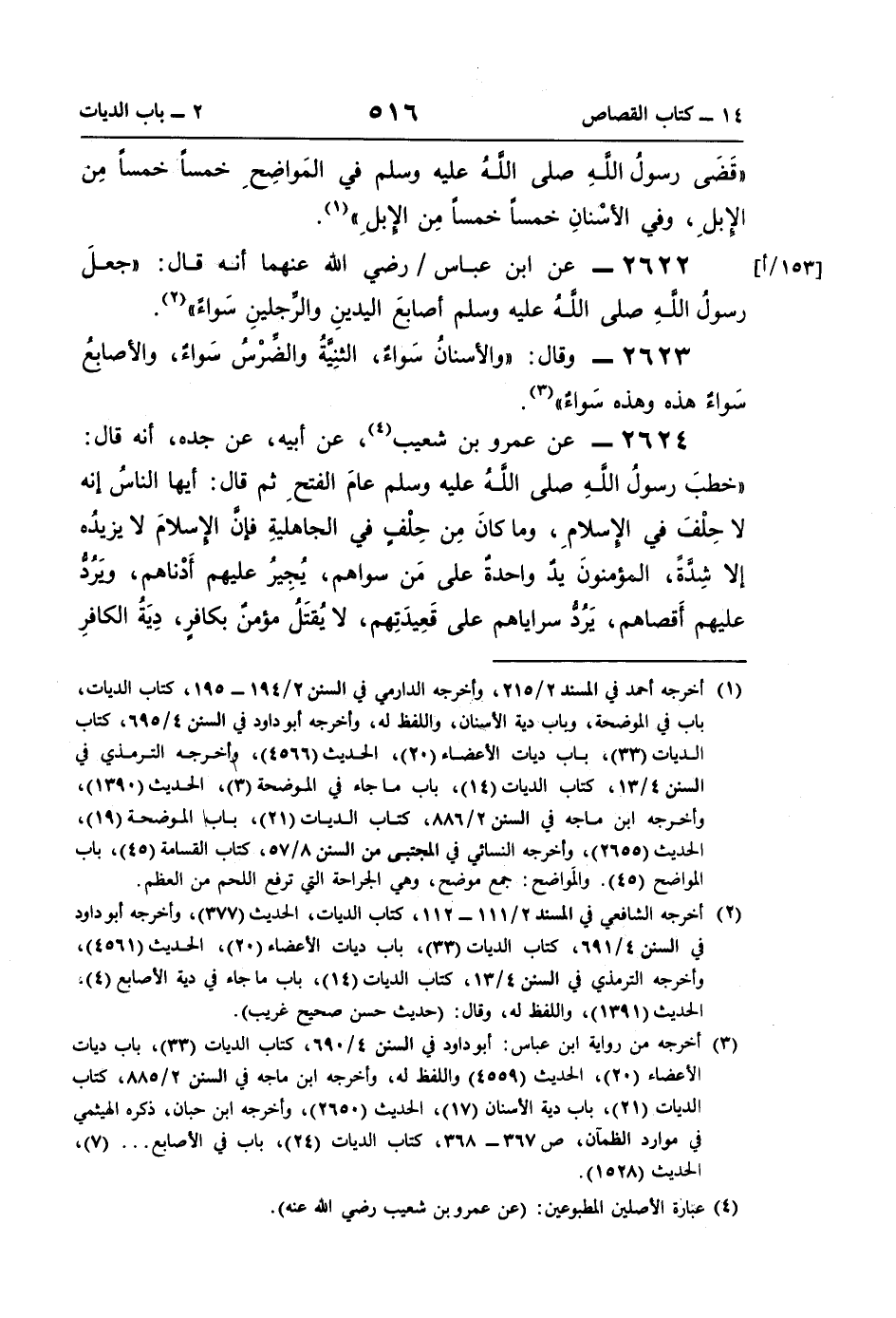 (¬3) أخرجه من رواية ابن عباس: أبو داود في السنن 4/ 690، كتاب الديات (33)، باب ديات الأعضاء (20)، الحديث (4559) واللفظ له، وأخرجه ابن ماجه في السنن 2/ 885، كتاب الديات (21)، باب دية الأسنان (17)، الحديث (2650)، وأخرجه ابن حبان، ذكره الهيثمي في موارد الظمآن، ص 367 - 368، كتاب الديات (24)، باب في الأصابع. . . (7)، الحديث (1528).