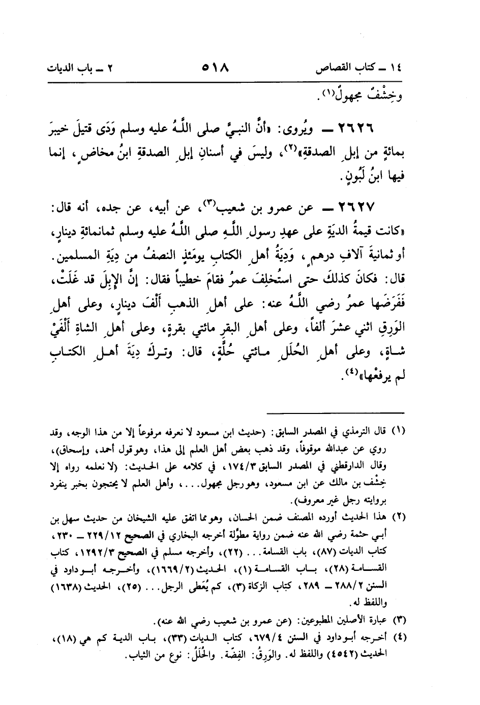 2627 - عن عمرو بن شعيب (¬3)، عن أبيه، عن جده، أنّه قال: "كانت قيمةُ الديَةِ على عهدِ رسولِ اللَّهِ صلى اللَّهُ عليه وسلم ثمانمائةِ دينارٍ، أو ثمانيةَ آلافِ درهمٍ، وَدِيَةُ أهلِ الكتابِ يومَئذٍ النصفُ من دِيَةِ المسلمين. قال: فكانَ كذلكَ حتَّى استُخلِفَ عمرُ فقامَ خطيبًا فقال: إنَّ الإِبِلَ قد غَلَتْ، فَفَرَضَها عمرُ رضي اللَّهُ عنه: على أهلِ الذهبِ أَلْفَ دينارٍ، وعلى أهلِ الوَرِقِ اثني عشرَ ألفًا، وعلى أهلِ البقرِ مائتي بقرةٍ، وعلى أهلِ الشاةِ أَلْفَيْ شاةٍ، وعلى أهلِ الحُلَلِ مائتي حُلَّةٍ، قال: وتركَ دِيَةَ أهلِ الكتابِ لم يرفعْها" (¬4).