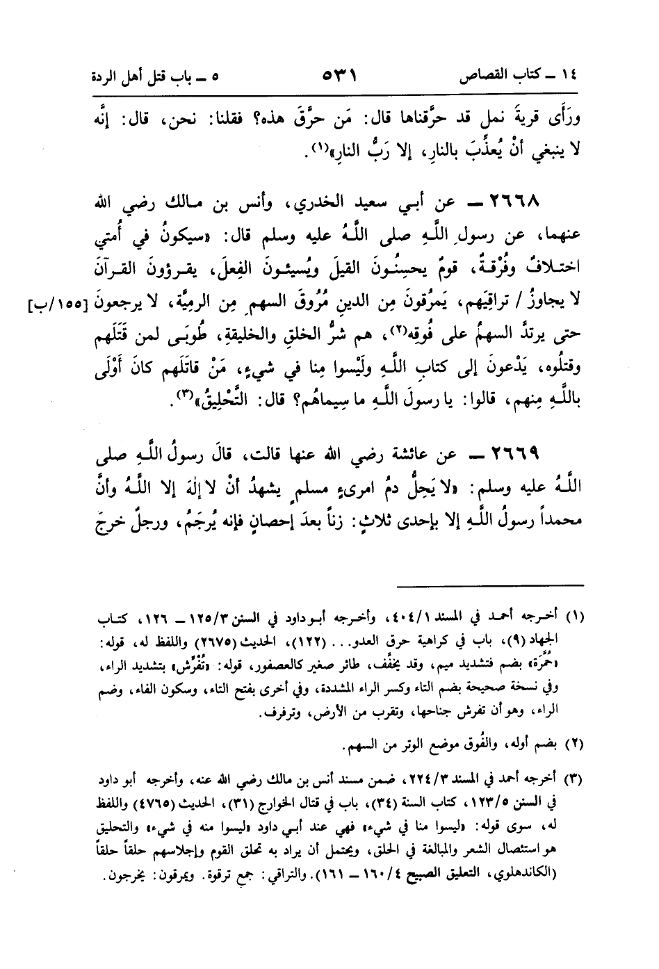 (¬3) أخرجه أحمد في المسند 3/ 224، ضمن مسند أنس بن مالك رضي اللَّه عنه، وأخرجه أبو داود في السنن 5/ 123، كتاب السنة (34)، باب في قتال الخوارج (31)، الحديث (4765) واللفظ له، سوى قوله: "ليسوا منا في شيء" فهي عند أبي داود "ليسوا منه في شيء" والتحليق هو استئصال الشعر والمبالغة في الحلق، ويحتمل أن يراد به تحلق القوم وإجلاسهم حلقًا حلقًا (الكاندهلوي، التعليق الصبيح 4/ 160 - 161). والتراقي: جمع ترقوة. ويمرقون: يخرجون.
