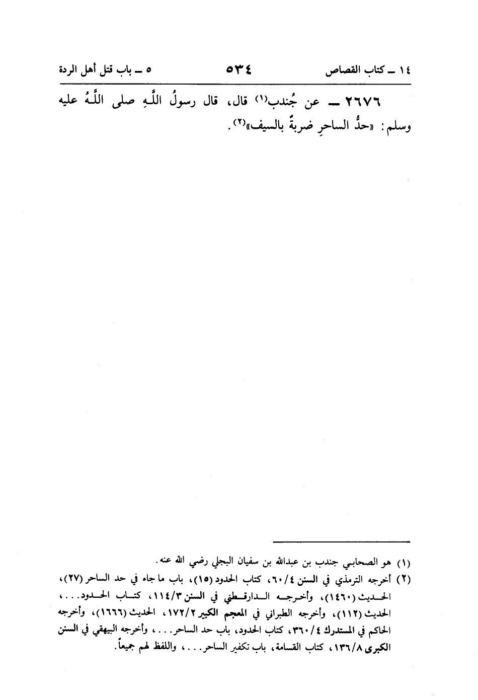 2676 - عن جُندب (¬1) قال، قال رسولُ اللَّهِ صلى اللَّهُ عليه وسلم: "حدُّ الساحرِ ضربةٌ بالسيف" (¬2).