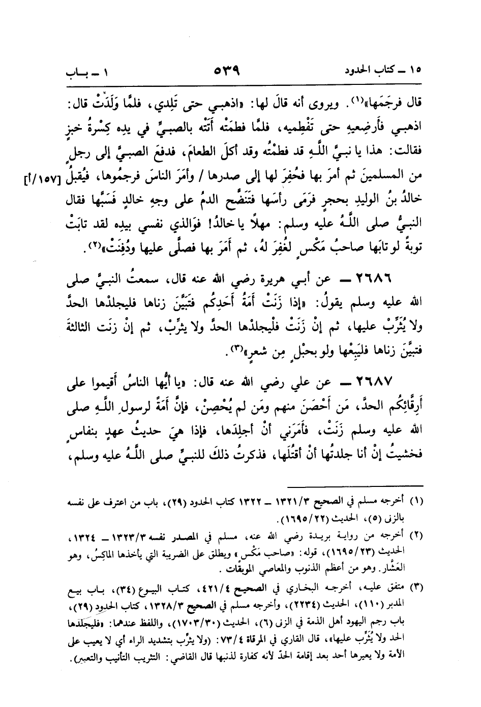 2686 - عن أبي هريرة رضي اللَّه عنه قال، سمعتُ النبيَّ صلى اللَّه عليه وسلم يقولُ: "إذا زَنَتْ أَمَةُ أَحَدِكُم فتَبَيَّنَ زناها فليجلدْها الحدَّ ولا يُثَرِّبْ عليها، ثمَّ إنْ زَنَتْ فلْيجلدْها الحدَّ ولا يثرِّبْ، ثمَّ إنْ زنَت الثالثةَ فتبيَّنَ زناها فليَبِعْها ولو بحبْلٍ مِن شعرٍ" (¬3).