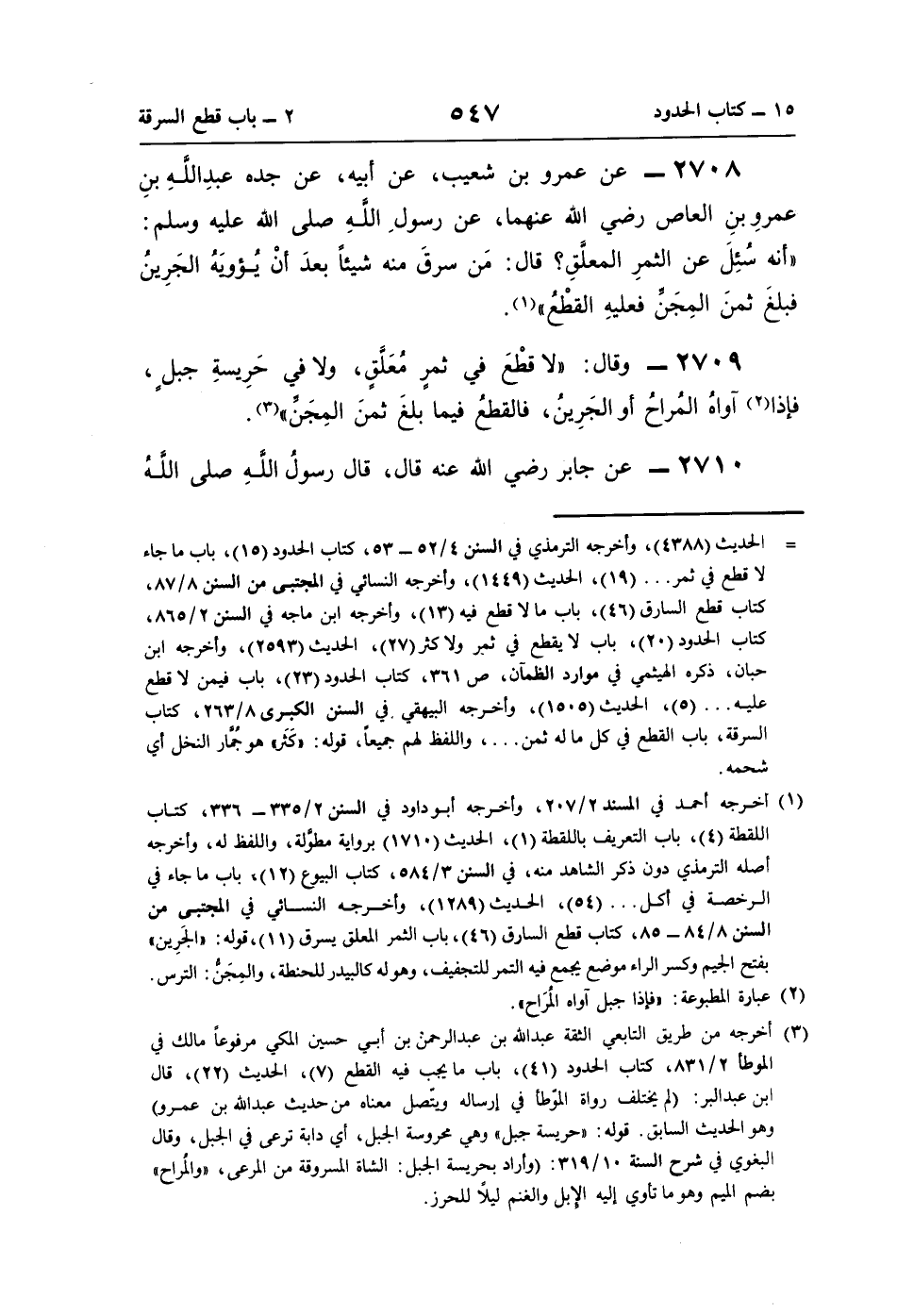 2708 - عن عمرو بن شعيب، عن أبيه، عن جده عبدِ اللَّهِ بنِ عمروِ بنِ العاص رضي اللَّه عنهما، عن رسولِ اللَّهِ صلى اللَّه عليه وسلم: "أنه سُئِلَ عن الثمرِ المعلَّقِ؟ قال: مَن سرقَ منه شيئًا بعدَ أنْ يُؤويَهُ الجَرِينُ فبلغَ ثمنَ المِجَنِّ فعليهِ القطْعُ" (¬1).