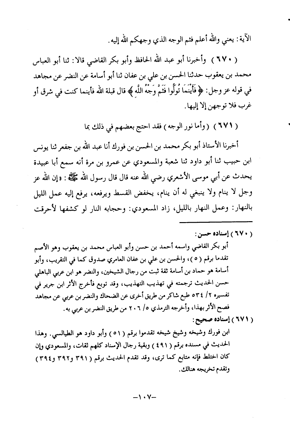 671 - وَأَمَّا نُورُ الْوَجْهِ فَقَدِ احْتَجَّ بَعْضُهُمْ فِي ذَلِكَ بِمَا أَخْبَرَنَا الْأُسْتَاذُ أَبُو بَكْرٍ مُحَمَّدُ بْنُ الْحَسَنِ بْنِ فُورَكٍ، أنا عَبْدُ اللَّهِ بْنُ جَعْفَرٍ، ثنا يُونُسُ بْنُ حَبِيبٍ، ثنا أَبُو دَاوُدُ، ثنا شُعْبَةُ وَالْمَسْعُودِيُّ عَنْ عَمْرِو بْنِ مُرَّةَ أَنَّهُ سَمِعَ أَبَا عُبَيْدَةَ يُحَدِّثُ عَنْ أَبِي مُوسَى الْأَشْعَرِيِّ رَضِيَ اللَّهُ عَنْهُ قَالَ: قَالَ رَسُولُ اللَّهِ صَلَّى اللهُ عَلَيْهِ وَسَلَّمَ: «إِنَّ §اللَّهَ عَزَّ وَجَلَّ لَا يَنَامُ وَلَا يَنْبَغِي لَهُ أَنْ يَنَامَ، يَخْفِضُ الْقِسْطَ وَيَرْفَعُهُ، يُرْفَعُ إِلَيْهِ عَمِلُ اللَّيْلِ بِالنَّهَارِ، وَعَمِلُ النَّهَارِ بِاللَّيْلِ» . زَادَ الْمَسْعُودِيُّ: «وَحِجَابُهُ النَّارُ لَوْ كَشَفَهَا لَأَحْرَقَتْ -[108]- سُبُحَاتُ وَجْهِهِ كُلَّ شَيْءٍ أَدْرَكَهُ بَصَرهُ» . ثُمَّ قَرَأَ أَبُو عُبَيْدَةَ: {بُورِكَ مَنْ فِي النَّارِ وَمَنْ حَوْلَهَا وَسُبْحَانَ اللَّهِ رَبِّ الْعَالَمِينَ} [النمل: 8] . أَخْرَجَهُ مُسْلِمٌ فِي الصَّحِيحِ مِنْ وَجْهٍ آخَرَ عَنْ شُعْبَةَ، وَأَخْرَجَهُ بِطُولِهِ مِنْ حَدِيثِ الْأَعْمَشِ عَنْ عَمْرِو بْنِ مُرَّةَ دُونَ قِرَاءَةِ أَبِي عُبَيْدَةَ.