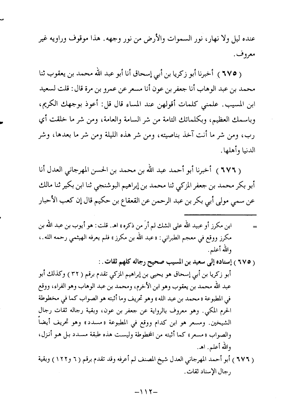 676 - أَخْبَرَنَا أَبُو أَحْمَدَ عَبْدُ اللَّهِ بْنِ مُحَمَّدِ بْنِ الْحَسَنِ الْمِهْرَجَانِيُّ الْعَدْلُ، أنا أَبُو بَكْرٍ مُحَمَّدُ بْنُ جَعْفَرٍ الْمُزَكِّي، ثنا مُحَمَّدُ بْنُ إِبْرَاهِيمَ الْبُوشَنْجِيُّ، ثنا ابْنُ بُكَيْرٍ، ثنا مَالِكٍ، عَنْ سُمَيٍّ مَوْلَى أَبِي بَكْرِ بْنِ عَبْدِ الرَّحْمَنِ، عَنِ الْقَعْقَاعِ بْنِ حَكِيمٍ، قَالَ: إِنَّ كَعْبَ الْأَحْبَارِ -[113]- قَالَ: §لَوْلَا كَلِمَاتٌ أَقُولُهُنَّ لَجَعَلَتْنِي يَهُودُ حِمَارًا. فَقِيلَ لَهُ: مَا هِيَ؟ فَقَالَ: أَعُوذُ بِوَجْهِ اللَّهِ الْعَظِيمِ الَّذِي لَيْسَ شَيْءٌ أَعْظَمَ مِنْهُ، وَبِكَلِمَاتِ اللَّهِ التَّامَّاتِ الَّتِي لَا يُجَاوِزُهُنَّ بَرٌّ وَلَا فَاجِرٌ، وَبِأَسْمَاءِ اللَّهِ الْحُسْنَى كُلِّهَا مَا عَلِمْتُ مِنْهَا وَمَا لَمْ أَعْلَمْ، مِنْ شَرِّ مَا خَلَقَ وَذَرَأَ وَبَرَأَ "
