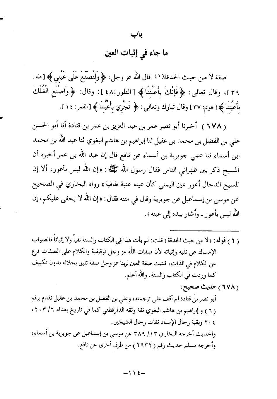 678 - أَخْبَرَنَا أَبُو نَصْرٍ عُمَرُ بْنُ عَبْدِ الْعَزِيزِ بْنِ عُمَرَ بْنِ قَتَادَةَ، أنا أَبُو الْحَسَنِ عَلِيُّ بْنُ الْفَضْلِ بْنِ مُحَمَّدِ بْنِ عَقِيلٍ، ثنا إِبْرَاهِيمُ بْنُ هَاشِمٍ الْبَغَوِيُّ، ثنا عَبْدُ اللَّهِ بْنُ مُحَمَّدِ بْنِ أَسْمَاءٍ، ثنا عَمِّي، جُوَيْرِيَةُ بْنُ أَسْمَاءٍ عَنْ نَافِعٍ، قَالَ: إِنَّ عَبْدَ اللَّهِ بْنَ عُمَرَ أَخْبَرَهُ أَنَّ الْمَسِيحَ ذُكِرَ بَيْنَ ظَهْرَانَيِ النَّاسِ، فَقَالَ رَسُولُ اللَّهِ صَلَّى اللهُ عَلَيْهِ وَسَلَّمَ: «إِنَّ §اللَّهَ لَيْسَ بِأَعْوَرَ، أَلَا إِنَّ الْمَسِيحَ الدَّجَّالَ أَعْوَرُ عَيْنِ الْيُمْنَى كَأَنَّ عَيْنَهُ عِنَبَةٌ طَافِيَةٌ» . رَوَاهُ الْبُخَارِيُّ فِي الصَّحِيحِ عَنْ مُوسَى بْنِ إِسْمَاعِيلَ عَنْ جُوَيْرِيَةَ وَقَالَ فِي مَتْنِهِ فَقَالَ: «إِنَّ اللَّهَ لَا يَخْفَى عَلَيْكُمْ، إِنَّ اللَّهَ لَيْسَ بِأَعْوَرَ» . وَأَشَارَ بِيَدِهِ إِلَى عَيْنِهِ