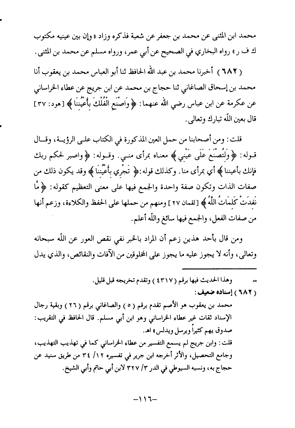 682 - أَخْبَرَنَا مُحَمَّدُ بْنُ عَبْدِ اللَّهِ الْحَافِظُ، ثنا أَبُو الْعَبَّاسِ مُحَمَّدُ بْنُ يَعْقُوبَ، أنا مُحَمَّدُ بْنُ إِسْحَاقَ الصَّاغَانِيُّ، ثنا حَجَّاجُ بْنُ مُحَمَّدٍ، عَنِ ابْنِ جُرَيْجٍ، عَنْ عَطَاءٍ الْخُرَاسَانِيِّ، عَنْ عِكْرِمَةَ، عَنِ ابْنِ عَبَّاسٍ، رَضِيَ اللَّهُ عَنْهُمَا: {§وَاصْنَعِ الْفُلْكَ بِأَعْيُنِنَا} [هود: 37] قَالَ: بِعَيْنِ اللَّهِ تَبَارَكَ وَتَعَالَى. قُلْتُ: وَمِنْ أَصْحَابِنَا مَنْ حَمَلَ الْعَيْنَ الْمَذْكُورَةَ فِي الْكِتَابِ عَلَى الرُّؤْيَةِ، وَقَالَ: قَوْلُهُ: {وَلِتُصْنَعَ عَلَى عَيْنِي} [طه: 39] مَعْنَاهُ: بِمَرْأَى مِنِّي. وَقَوْلُهُ: {وَاصْبِرْ لِحُكْمِ رَبِّكَ فَإِنَّكَ بِأَعْيُنِنَا} [الطور: 48] أَيْ: بِمَرْأَى مِنَّا. وَكَذَلِكَ قَوْلُهُ: {تَجْرِي بِأَعْيُنِنَا} [القمر: 14] وَقَدْ يَكُونُ ذَلِكَ مِنْ صِفَاتِ الذَّاتِ وَتَكُونُ صِفَةً وَاحِدَةً وَالْجَمْعُ فِيهَا عَلَى مَعْنَى التَّعْظِيمِ، كَقَوْلِهِ: {مَا نَفِدَتْ كَلِمَاتُ اللَّهِ} [لقمان: 27] وَمِنْهُمْ مِنْ حَمْلَهَا عَلَى الْحِفْظِ وَالْكِلَاءَةِ، وَزَعَمَ أَنَّهَا مِنْ صِفَاتِ الْفِعْلِ، وَالْجَمْعُ فِيهَا سَائِغٌ وَاللَّهُ أَعْلَمُ. وَمَنْ قَالَ بِأَحَدِ هَذَيْنِ زَعَمَ أَنَّ الْمُرَادَ بِالْخَبَرِ نَفْيُ نَقْصِ الْعَوَرِ عَنِ اللَّهِ سُبْحَانَهُ وَتَعَالَى، وَأَنَّهُ لَا يَجُوزُ عَلَيْهِ مَا يَجُوزُعَلَى الْمَخْلُوقِينَ مِنَ الَآفَاتِ وَالنَّقَائِصِ، وَالَّذِي يَدُلُّ -[117]- عَلَيْهِ ظَاهَرُ الْكِتَابِ وَالسُّنَّةِ مِنْ إِثْبَاتِ الْعَيْنِ لَهُ صِفَةً لَا مِنْ حَيْثُ الْحَدَقَةِ أَوْلَى وَبِاللَّهِ التَّوْفِيقُ