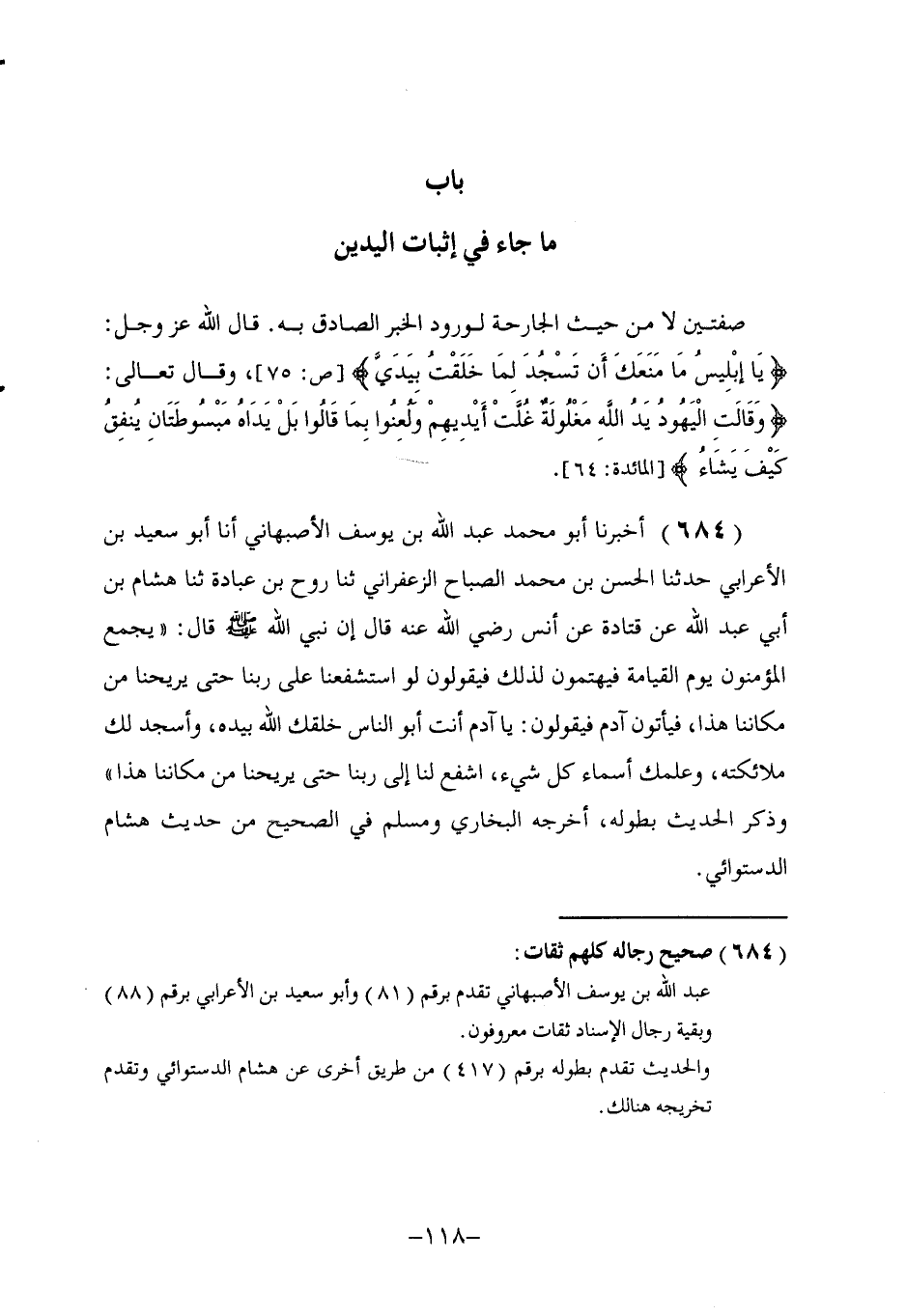 §بَابُ مَا جَاءَ فِي إِثْبَاتِ الْيَدَيْنِ صِفَتَيْنِ لَا مِنْ حَيْثُ الْجَارِحَةِ لِوُرُودِ الْخَبَرِ الصَّادِقِ بِهِ. قَالَ اللَّهُ عَزَّ وَجَلَّ: {يَا إِبْلِيسُ مَا مَنَعَكَ أَنْ تَسْجُدَ لِمْا خَلَقْتُ بِيَدَيَّ} [ص: 75] ، وَقَالَ تَعَالَى {وَقَالَتِ الْيَهُودُ يَدُ اللَّهِ مَغْلُولَةٌ غُلَّتْ أَيْدِيهِمْ وَلُعِنُوا بِمَا قَالُوا بَلْ يَدَاهُ مَبْسُوطَتَانِ يُنْفِقُ كَيْفَ يَشَاءُ} [المائدة: 64] .