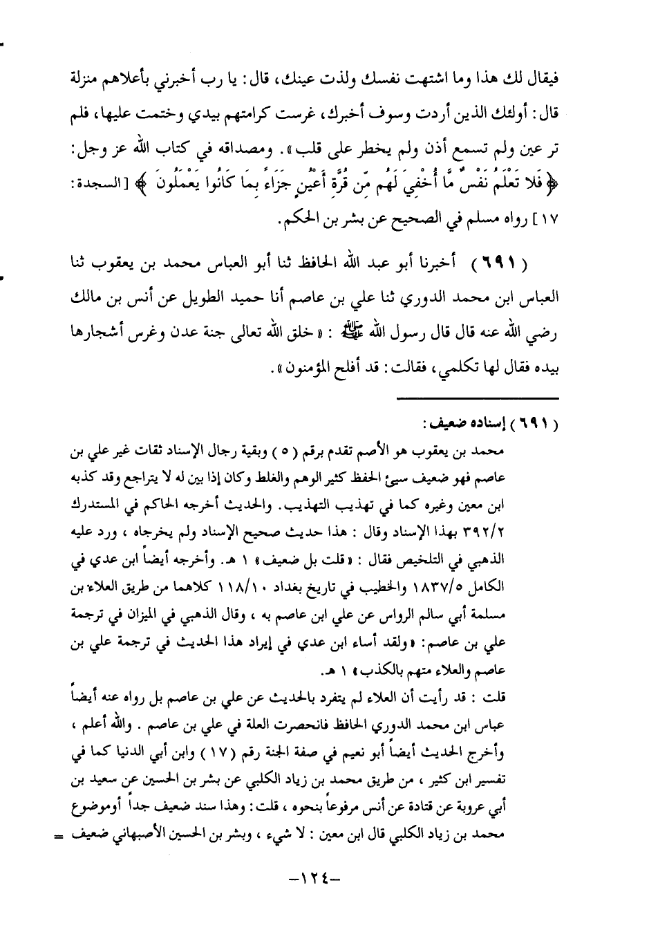 691 - أَخْبَرَنَا أَبُو عَبْدِ اللَّهِ الْحَافِظُ، ثنا أَبُو الْعَبَّاسِ مُحَمَّدُ بْنُ يَعْقُوبَ، ثنا الْعَبَّاسُ بْنُ مُحَمَّدٍ الدُّورِيُّ، ثنا عَلِيُّ بْنُ عَاصِمٍ، أنا حُمَيْدٌ الطَّوِيلُ، عَنْ أَنَسِ بْنِ مَالِكٍ، رَضِيَ اللَّهُ عَنْهُ قَالَ: قَالَ رَسُولُ اللَّهِ صَلَّى اللهُ عَلَيْهِ وَسَلَّمَ: " §خَلَقَ اللَّهُ تَعَالَى جَنَّةَ عَدْنٍ وَغَرَسَ أَشْجَارَهَا بِيَدِهِ، فَقَالَ لَهَا: تَكَلَّمِي، فَقَالَتْ: {قَدْ أَفْلَحَ الْمُؤْمِنُونَ} [المؤمنون: 1] "