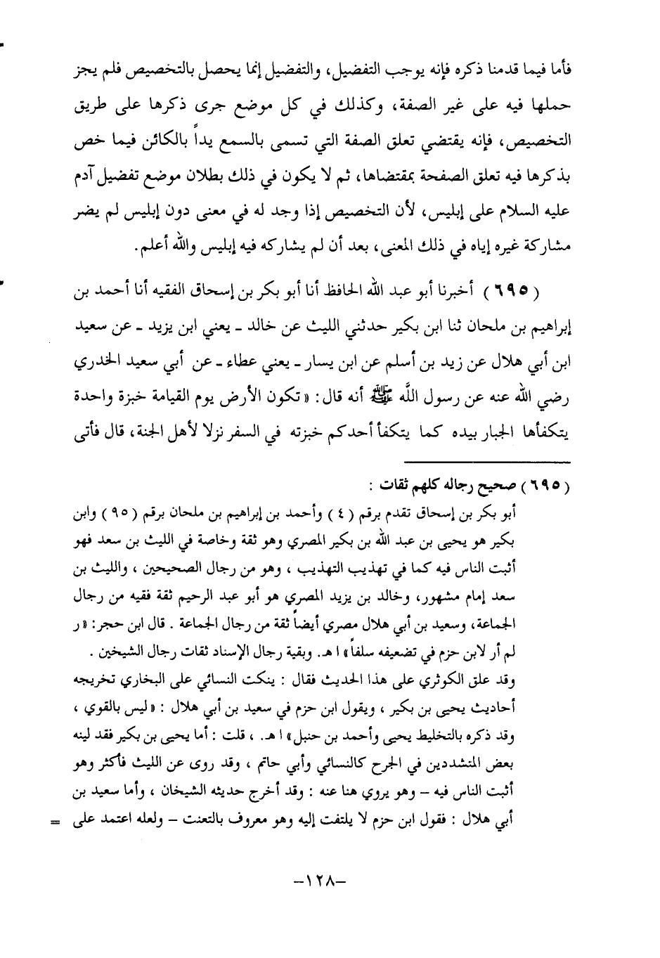695 - أَخْبَرَنَا أَبُو عَبْدِ اللَّهِ الْحَافِظُ، أنا أَبُو بَكْرِ بْنُ إِسْحَاقَ الْفَقِيهُ، أنا أَحْمَدُ بْنُ إِبْرَاهِيمَ بْنِ مِلْحَانَ، ثنا ابْنُ بُكَيْرٍ، حَدَّثَنِي اللَّيْثُ، عَنْ خَالِدٍ يَعْنِي ابْنَ يَزِيدَ، عَنْ سَعِيدِ بْنِ أَبِي هِلَالٍ، عَنْ زَيْدِ بْنِ أَسْلَمَ، عَنِ ابْنِ يَسَارٍ يَعْنِي عَطَاءً، عَنْ أَبِي سَعِيدٍ الْخُدْرِيِّ، رَضِيَ اللَّهُ عَنْهُ، عَنْ رَسُولِ اللَّهِ صَلَّى اللهُ عَلَيْهِ وَسَلَّمَ أَنَّهُ قَالَ: §«تَكُونُ الْأَرْضُ يَوْمَ الْقِيَامَةِ خُبْزَةً وَاحِدَةً يَتَكَفَّؤُهَا الْجَبَّارُ بِيَدِهِ كَمَا يَتَكَفَّأُ أَحَدُكُمْ خُبْزَتَهُ فِي السَّفَرِ نُزُلًا لِأَهْلِ الْجَنَّةِ» . قَالَ: فَأَتَى -[129]- رَجُلٌ مِنَ الْيَهُودِ فَقَالَ: بَارَكَ الرَّحْمَنُ عَلَيْكَ يَا أَبَا الْقَاسِمِ، أَلَا أُخْبِرُكَ بِنُزُلِ أَهْلِ الْجَنَّةِ يَوْمَ الْقِيَامَةِ؟ قَالَ: «بَلَى» . قَالَ: تَكُونُ الْأَرْضُ خُبْزَةً وَاحِدَةً كَمَا قَالَ رَسُولُ اللَّهِ صَلَّى اللهُ عَلَيْهِ وَسَلَّمَ. قَالَ: فَنَظَرَ رَسُولُ اللَّهِ صَلَّى اللهُ عَلَيْهِ وَسَلَّمَ إِلَيْنَا ثُمَّ ضَحِكَ حَتَّى بَدَتْ نَوَاجِذُهُ، ثُمَّ قَالَ: أَلَا أُخْبِرُكَ بِإِدَامِهِمْ؟ قَالَ: إِدَامُهُمْ بَالَامٌ وَنُونٌ. قَالَ: «وَمَا هَذَا؟» قَالَ: ثَوْرٌ وَنُونٌ يَأْكُلُ مِنْ زِيَادَةِ كَبِدَيْهِمَا سَبْعُونَ أَلْفًا". رَوَاهُ الْبُخَارِيُّ فِي الصَّحِيحِ عَنْ يَحْيَى بْنِ بُكَيْرٍ، وَأَخْرَجَهُ مُسْلِمٌ مِنْ وَجْهٍ آخَرَ عَنِ اللَّيْثِ