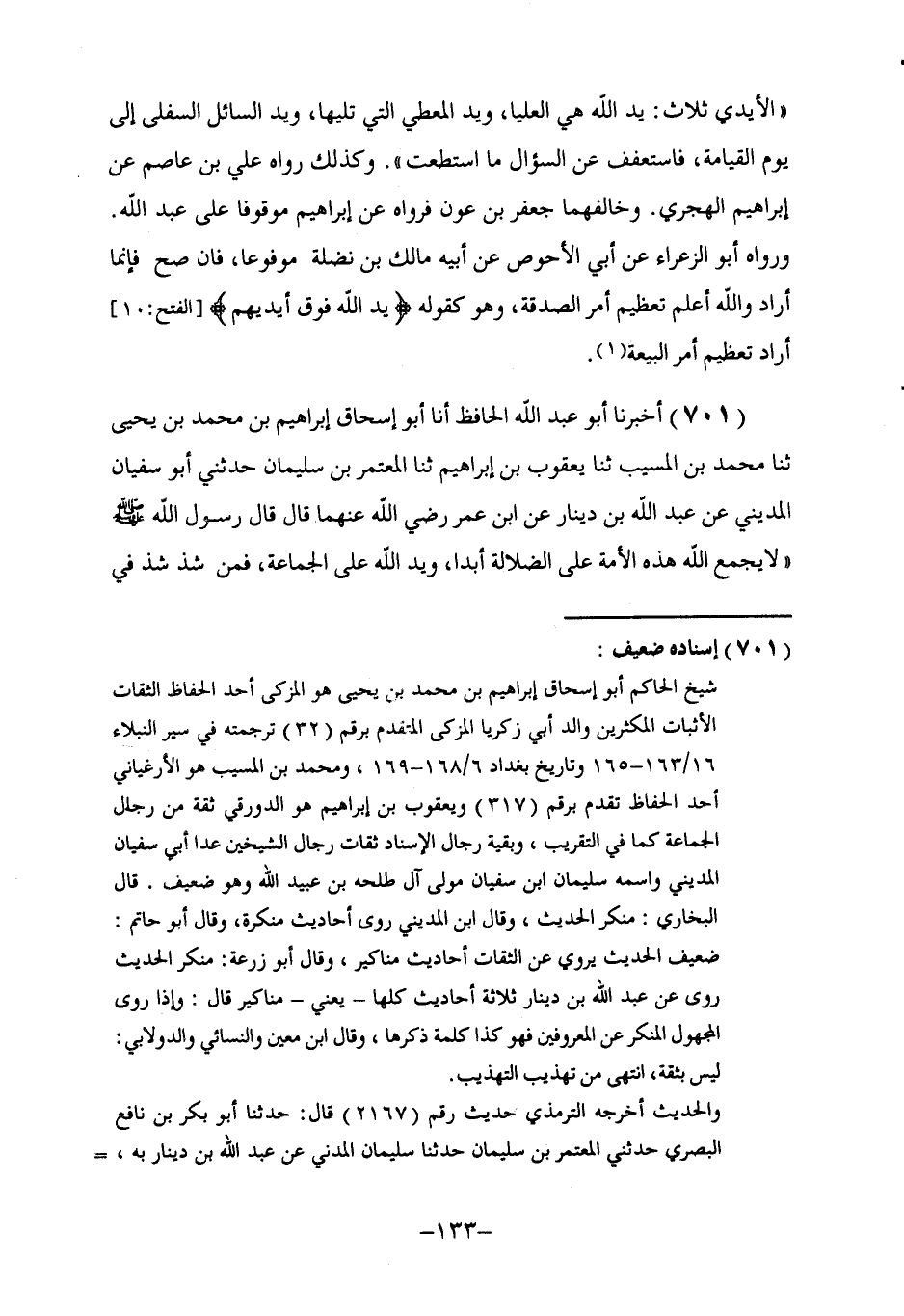 701 - أَخْبَرَنَا أَبُو عَبْدِ اللَّهِ الْحَافِظُ، أنا أَبُو إِسْحَاقَ إِبْرَاهِيمُ بْنُ مُحَمَّدِ بْنِ يَحْيَى، ثنا مُحَمَّدُ بْنُ الْمُسَيِّبِ، ثنا يَعْقُوبُ بْنُ إِبْرَاهِيمَ، ثنا الْمُعْتَمِرُ بْنُ سُلَيْمَانَ، حَدَّثَنِي أَبُو سُفْيَانَ الْمَدِينِيُّ، عَنْ عَبْدِ اللَّهِ بْنِ دِينَارٍ، عَنِ ابْنِ عُمَرَ، رَضِيَ اللَّهُ عَنْهُمَا، قَالَ: قَالَ رَسُولُ اللَّهِ صَلَّى اللهُ عَلَيْهِ وَسَلَّمَ: «§لَا يَجْمَعُ اللَّهُ هَذِهِ الْأُمَّةَ عَلَى الضَّلَالَةِ أَبَدًا، وَيَدُ اللَّهِ عَلَى الْجَمَاعَةِ، فَمَنْ شَذَّ شَذَّ فِي -[134]- النَّارِ» . أَبُو سُفْيَانَ الْمَدِينِيُّ يُقَالُ: إِنَّهُ سُلَيْمَانُ بْنُ سُفْيَانَ، وَاخْتُلِفَ فِي كُنْيَتِهِ وَلَيْسَ بِمَعْرُوفٍ