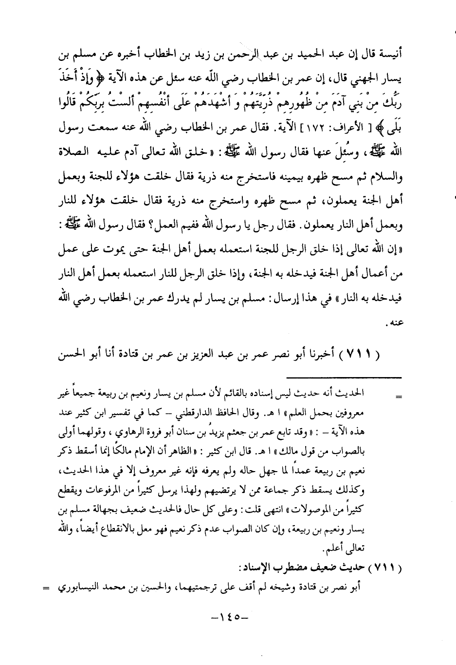 711 - أَخْبَرَنَا أَبُو نَصْرٍ عُمَرُ بْنُ عَبْدِ الْعَزِيزِ بْنِ عُمَرَ بْنِ قَتَادَةَ، أنا أَبُو الْحَسَنِ -[146]- مُحَمَّدُ بْنُ أَحْمَدَ بْنِ زَكَرِيَّا الْأَدِيبُ، ثنا أَبُو عَلِيٍّ الْحُسَيْنُ بْنُ مُحَمَّدِ بْنِ زِيَادٍ الْقَبَّانِيُّ، ثنا إِسْحَاقُ بْنُ إِبْرَاهِيمَ، أنا بَقِيَّةُ بْنُ الْوَلِيدِ، حَدَّثَنِي الزُّبَيْدِيُّ مُحَمَّدُ بْنُ الْوَلِيدِ، عَنْ رَاشِدِ بْنِ سَعْدٍ، عَنْ عَبْدِ الرَّحْمَنِ بْنِ أَبِي قَتَادَةَ النَّصْرِيِّ، عَنْ أَبِيهِ، عَنْ هِشَامِ بْنِ حَكِيمٍ، قَالَ: " إِنَّ -[147]- رَجُلًا قَالَ: يَا رَسُولَ اللَّهِ أَيُبْتَدَأُ الْأَعْمَالُ أُمْ قَدْ قُضِيَ الْقَضَاءُ؟ فَقَالَ: §«إِنَّ اللَّهَ عَزَّ وَجَلَّ لَمَّا أَخْرَجَ ذُرِّيَّةَ آدَمَ مِنْ ظَهْرِهِ أُشْهِدُهُمْ عَلَى أَنْفُسِهِمْ» ح