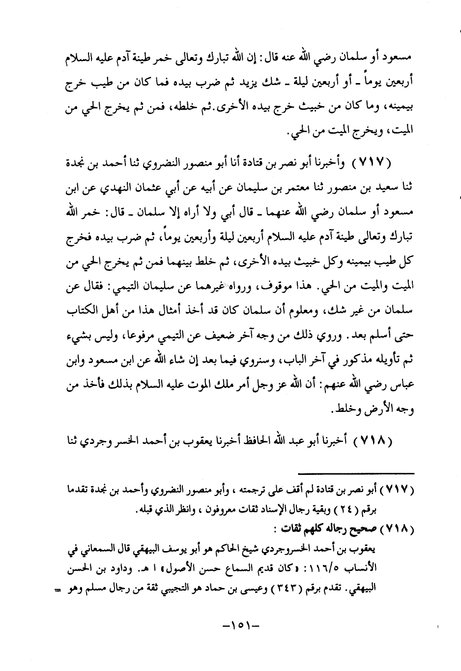 717 - وَأَخْبَرَنَا أَبُو نَصْرِ بْنُ قَتَادَةَ، أنا أَبُو مَنْصُورٍ النَّضْرَوِيُّ، ثنا أَحْمَدُ بْنُ نَجْدَةَ، ثنا سَعِيدُ بْنُ مَنْصُورٍ، ثنا مُعْتَمِرُ بْنُ سُلَيْمَانَ، عَنْ أَبِيهِ، عَنْ أَبِي عُثْمَانَ النَّهْدِيِّ، عَنِ ابْنِ مَسْعُودٍ، أَوْ سَلْمَانَ رَضِيَ اللَّهُ عَنْهُمَا ـ قَالَ أَبِي وَلَا أُرَاهُ إِلَّا سَلْمَانَ ـ قَالَ: §خَمَّرَ اللَّهُ تَبَارَكَ وَتَعَالَى طِينَةَ آدَمَ عَلَيْهِ السَّلَامُ أَرْبَعِينَ لَيْلَةً وَأَرْبَعِينَ يَوْمًا، ثُمَّ ضَرَبَ بِيَدِهِ فَخَرَجَ كُلُّ طَيِّبٍ بِيَمِينِهِ، وَكُلُّ خَبِيثٍ بِيَدِهِ الْأُخْرَى، ثُمَّ خَلَطَ بَيْنَهُمَا، فَمِنْ ثَمَّ يُخْرِجُ الْحَيَّ مِنَ الْمَيِّتِ وَالْمَيِّتَ مِنَ الْحَيِّ. هَذَا مَوْقُوفٌ، وَرَوَاهُ غَيْرُهُمَا عَنْ سُلَيْمَانَ التَّيْمِيِّ، فَقَالَ: عَنْ سَلْمَانَ مِنْ غَيْرِ شَكٍّ، وَمَعْلُومٌ أَنَّ سَلْمَانَ كَانَ قَدْ أَخَذَ أَمْثَالَ هَذَا مِنْ أَهْلِ الْكِتَابِ حَتَّى أَسْلَمَ بَعْدُ. وَرُوِيَ ذَلِكَ مِنْ وَجْهٍ آخَرَ ضَعِيفٍ عَنِ التَّيْمِيِّ مَرْفُوعًا، وَلَيْسَ بِشَيْءٍ، ثُمَّ تَأْوِيلُهُ مَذْكُورٌ فِي آخِرِ الْبَابِ، وَسَنَرْوِي فِيمَا بَعْدُ، إِنْ شَاءَ اللَّهُ، عَنِ ابْنِ مَسْعُودٍ وَابْنِ عَبَّاسٍ رَضِيَ اللَّهُ عَنْهُمْ: أَنَّ اللَّهَ عَزَّ وَجَلَّ أَمَرَ مَلَكَ الْمَوْتِ عَلَيْهِ السَّلَامُ بِذَلِكَ فَأَخَذَ مِنْ وَجْهِ الْأَرْضِ وَخَلَطَ