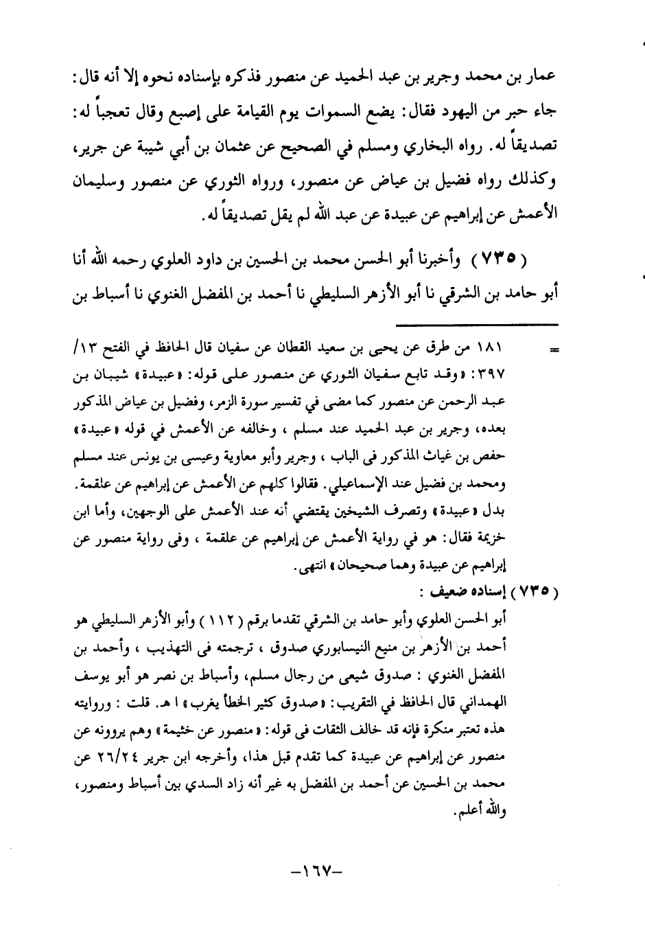 735 - وَأَخْبَرَنَا أَبُو الْحَسَنِ مُحَمَّدُ بْنُ الْحُسَيْنِ بْنِ دَاوُدَ الْعَلَوِيُّ رَحِمَهُ اللَّهُ، أنا أَبُو حَامِدِ بْنُ الشَّرْقِيِّ، نا أَبُو الْأَزْهَرِ السَّلِيطِيِّ، نا أَحْمَدُ بْنُ الْمُفَضَّلِ الْغَنَوِيُّ، نا أَسْبَاطُ بْنُ -[168]- نَصْرٍ، عَنْ مَنْصُورٍ، عَنْ خَيْثَمَةَ بْنِ عَبْدِ الرَّحْمَنِ، عَنْ عَلْقَمَةَ، عَنْ عَبْدِ اللَّهِ بْنِ مَسْعُودٍ، قَالَ: كُنَّا عِنْدَ رَسُولِ اللَّهِ صَلَّى اللهُ عَلَيْهِ وَسَلَّمَ حِينَ جَاءَهُ حَبْرٌ مِنْ أَحْبَارِ الْيَهُودِ، فَجَلَسَ إِلَيْهِ فَقَالَ لَهُ النَّبِيُّ صَلَّى اللهُ عَلَيْهِ وَسَلَّمَ: «حَدِّثْنَا» . قَالَ: إِنَّ اللَّهَ عَزَّ وَجَلَّ إِذَا كَانَ يَوْمُ الْقِيَامَةِ §جَعَلَ السَّمَاوَاتِ عَلَى إِصْبَعٍ، وَالْأَرَضِينَ عَلَى إِصْبَعٍ، وَالْجِبَالَ عَلَى إِصْبَعٍ وَالْمَاءَ وَالشَّجَرَ عَلَى إِصْبَعٍ، وَجَمِيعَ الْخَلَائِقِ عَلَى إِصْبَعٍ ثُمَّ يَهُزُّهُنَّ يَقُولُ: أَنَا الْمَلِكُ. فَضَحِكَ رَسُولُ اللَّهِ صَلَّى اللهُ عَلَيْهِ وَسَلَّمَ حَتَّى بَدَتْ نَوَاجِذُهُ تَصْدِيقًا لِمَا قَالَ. ثُمَّ قَرَأَ الْآيَةَ: {وَمَا قَدَرُوا اللَّهَ حَقَّ قَدْرِهِ وَالْأَرْضُ جَمِيعًا قَبْضَتُهُ يَوْمَ الْقِيَامَةِ} [الزمر: 67] إِلَى قَوْلِهِ: {سُبْحَانَهُ وَتَعَالَى عَمَّا يُشْرِكُونَ} [الزمر: 67] قَرَأَهَا كُلَّهَا. وَكَذَلِكَ رَوَاهُ ابْنُ أَبِي الْحُنَيْنِ الْكُوفِيِّ عَنِ الْغَنَوِيِّ. قَالَ الشَّيْخُ رَضِيَ اللَّهُ عَنْهُ: أَمَّا الْمُتَقَدِّمُونَ مِنْ أَصْحَابِنَا فَإِنَّهُمْ لَمْ يَشْتَغِلُوا بِتَأْوِيلِ هَذَا الْحَدِيثِ، وَمَا جَرَى مَجْرَاهُ، وَإِنَّمَا فَهِمُوا مِنْهُ وَمِنْ أَمْثَالِهِ مَا سَيقَ لِأَجْلِهِ مِنْ إِظْهَارِ قُدْرَةِ اللَّهِ تَعَالَى وَعِظَمِ شَأْنِهِ، وَأَمَّا الْمُتَأَخِّرُونَ مِنْهُمْ فَإِنَّهُمْ تَكَلَّمُوا فِي تَأْوِيلِهِ بِمَا يَحْتَمِلُهُ؛ فَذَهَبَ أَبُو سُلَيْمَانَ الْخَطَّابِيُّ رَحِمَهُ اللَّهُ إِلَى أَنَّ الْأَصْلَ فِي هَذَا وَمَا أَشْبَهَهُ فِي إِثْبَاتِ الصِّفَاتِ أَنَّهُ لَا يَجُوزُ ذَلِكَ إِلَّا أَنْ يَكُونَ بِكِتَابٍ نَاطِقٍ أَوْ خَبَرٍ مَقْطُوعٍ بِصَحَّتِهِ، فَإِنْ لَمْ يَكُونَا فِيمَا يَثْبُتُ مِنْ أَخْبَارِ الْآحَادِ الْمُسْتَنِدَةِ إِلَى أَصْلٍ فِي الْكِتَابِ أَوْ فِي السُّنَّةِ الْمَقْطُوعِ بِصِحَّتِهَا أَوْ بِمُوَافَقَةِ مَعَانِيهَا، وَمِمَّا كَانَ بِخِلَافِ ذَلِكَ فَالتَّوَقُّفُ عَنْ إِطْلَاقِ الِاسْمِ بِهِ هُوَ الْوَاجِبُ، وَيُتَأَوَّلُ حِينَئِذٍ عَلَى مَا يَلِيقُ بِمَعَانِي الْأُصُولِ الْمُتَّفَقِ عَلَيْهَا مِنْ أَقَاوِيلِ أَهْلِ الدِّينِ وَالْعِلْمِ مَعَ نَفْيِ التَّشْبِيهِ فِيهِ، هَذَا هُوَ الْأَصْلُ الَّذِي نَبْنِي عَلَيْهِ الْكَلَامَ -[169]- وَنَعْتَمِدُهُ فِي هَذَا الْبَابِ، وَذِكْرُ الْأَصَابِعِ لَمْ يُوجَدْ فِي شَيْءٍ مِنَ الْكِتَابِ وَلَا مِنَ السُّنَّةِ الَّتِي شَرْطُهَا فِي الثُّبُوتِ مَا وَصَفْنَاهُ، وَلَيْسَ مَعْنَى الْيَدِ فِي الصِّفَاتِ، بِمَعْنَى الْجَارِحَةِ حَتَّى يُتَوَهَّمَ بِثُبُوتِهَا ثُبُوتُ الْأَصَابِعَ، بَلْ هُوَ تَوْقِيفٌ شَرْعِيُّ، أَطْلَقْنَا الِاسْمَ فِيهِ عَلَى مَا جَاءَ بِهَ الْكِتَابُ مِنْ غَيْرِ تَكْيِيفٍ وَلَا تَشْبِيهٍ فَخَرَجَ بِذَلِكَ عَنْ أَنْ يَكُونَ لَهُ أَصْلٌ فِي الْكِتَابِ أَوِ السُّنَّةِ أَوْ أَنْ يَكُونَ عَلَى شَيْءٍ مِنْ مَعَانِيهَا، وَقَدْ رَوَى هَذَا الْحَدِيثَ غَيْرُ وَاحِدٍ مِنْ أَصْحَابِ عَبْدِ اللَّهِ مِنْ غَيْرِ طَرِيقِ عُبَيْدَةَ، فَلَمْ يُذْكَرْ فِيهِ قَوْلُهُ: «تَصْدِيقًا لِقَوْلِ الْحَبْرِ» . قَالَ الشَّيْخُ: قَدْ رُوِّينَا مُتَابَعَةَ عَلْقَمَةَ إِيَّاهُ فِي ذَلِكَ فِي بَعْضِ الرِّوَايَاتِ عَنْهُ. قَال