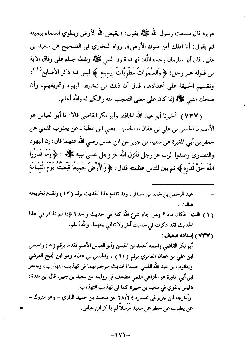 737 - أَخْبَرَنَا أَبُو عَبْدِ اللَّهِ الْحَافِظُ، وَأَبُو بَكْرٍ الْقَاضِي قَالَا: نا أَبُو الْعَبَّاسِ هُوَ الْأَصَمُّ، نا الْحَسَنُ بْنُ عَلِيِّ بْنِ عَفَّانَ، نا الْحَسَنُ يَعْنِي ابْنَ عَطِيَّةَ، عَنْ يَعْقُوبَ الْقُمِّيِّ، عَنْ جَعْفَرِ بْنِ أَبِي الْمُغِيرَةِ، عَنْ سَعِيدِ بْنِ جُبَيْرِ، عَنِ ابْنِ عَبَّاسٍ، رَضِيَ اللَّهُ عَنْهُمَا قَالَ: إِنَّ §الْيَهُودَ وَالنَّصَارَى وَصَفُوا الرَّبَّ عَزَّ وَجَلَّ فَأَنْزَلَ اللَّهُ عَزَّ وَجَلَّ عَلَى نَبِيِّهِ صَلَّى اللهُ عَلَيْهِ وَسَلَّمَ: {وَمَا قَدَرُوا اللَّهَ حَقَّ قَدْرِهِ} [الأنعام: 91] ثُمَّ بَيَّنَ لِلنَّاسِ عَظَمَتَهُ، فَقَالَ: {وَالْأَرْضُ جَمِيعًا قَبْضَتُهُ يَوْمَ الْقِيَامَةِ -[172]- وَالسَّمَاوَاتُ مَطْوِيَّاتٌ بِيَمِينِهِ سُبْحَانَهُ وَتَعَالَى عَمَّا يُشْرِكُونَ} [الزمر: 67] فَجَعَلَ وَصْفَهُمْ ذَلِكَ شِرْكًا. هَذَا الْأَثَرُ عَنِ ابْنِ عَبَّاسٍ إِنْ صَحَّ يُؤَكِّدُ مَا قَالَهُ أَبُو سُلَيْمَانَ رَحِمَهُ اللَّهُ. وَقَالَ أَبُو الْحَسَنِ عَلِيُّ بْنُ مُحَمَّدِ بْنِ مَهْدِيٍّ الطَّبَرِيُّ رَحِمَهُ اللَّهُ: إِنَّا لَا نُنْكِرُ هَذَا الْحَدِيثَ وَلَا نُبْطِلُهُ لِصِحَّةِ سَنَدِهِ، وَلَكِنْ لَيْسَ فِيهِ أَنَّهُ يَجْعَلُ ذَلِكَ عَلَى إِصْبَعِ نَفْسِهِ، وَإِنَّمَا فِيهِ أَنَّهُ يَجْعَلُ ذَلِكَ عَلَى إِصْبَعٍ، فَيُحْتَمَلَ أَنَّهُ أَرَادَ إِصْبَعًا مِنْ أَصَابِعِ خَلْقِهِ قَالَ: وَإِذَا لَمْ يَكُنْ ذَلِكَ فِي الْخَبَرِ لَمْ يَجِبْ أَنْ يَجْعَلَ لِلَّهِ إِصْبَعًا