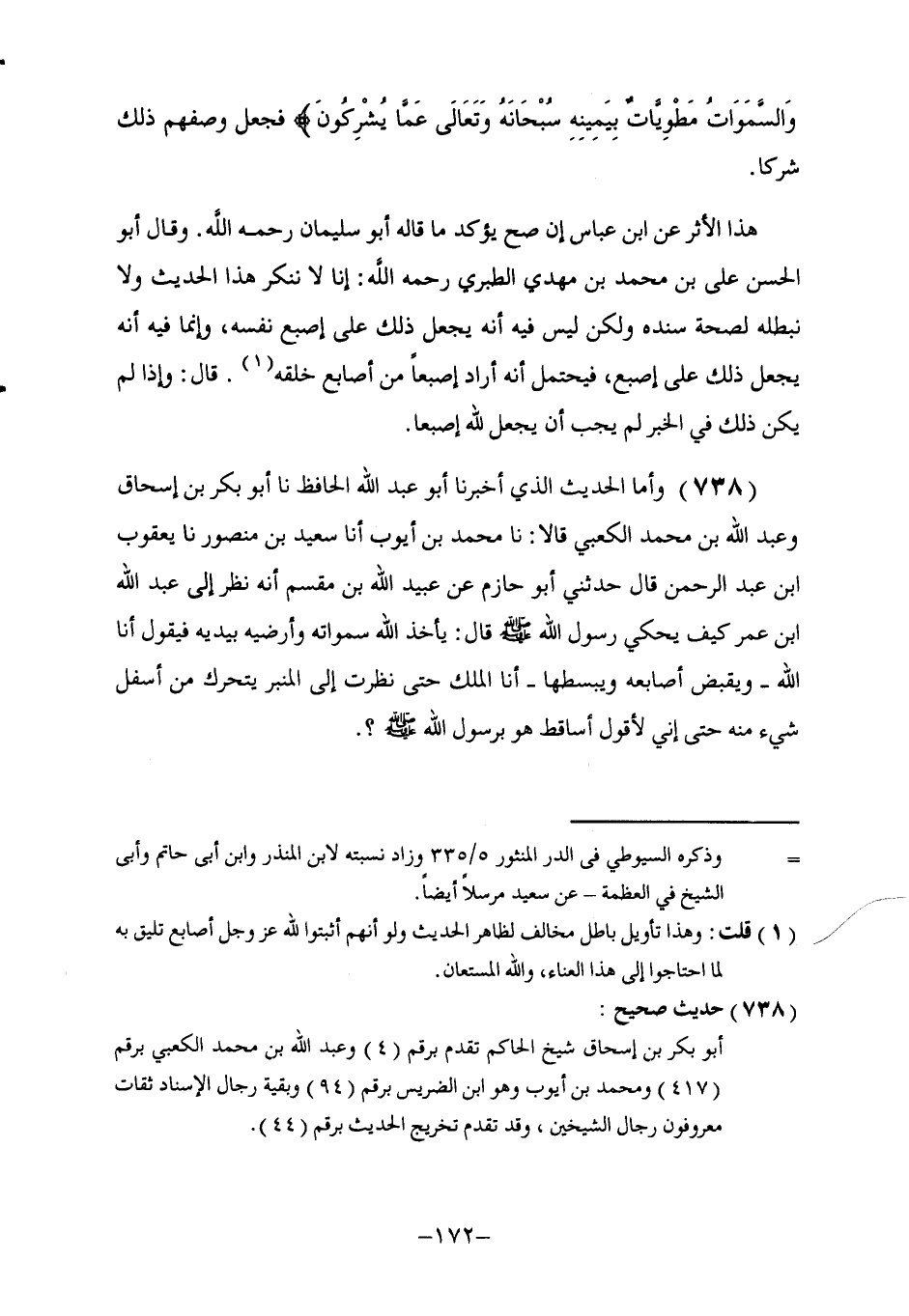738 - وَأَمَّا الْحَدِيثُ الَّذِي أَخْبَرَنَا أَبُو عَبْدِ اللَّهِ الْحَافِظُ، نا أَبُو بَكْرِ بْنُ إِسْحَاقَ، وَعَبْدُ اللَّهِ بْنُ مُحَمَّدٍ الْكَعْبِيُّ، قَالَا: نا مُحَمَّدُ بْنُ أَيُّوبَ، أنا سَعِيدُ بْنُ مَنْصُورٍ، نا يَعْقُوبُ بْنُ عَبْدِ الرَّحْمَنِ، قَالَ: حَدَّثَنِي أَبُو حَازِمٍ، عَنْ عُبَيْدِ اللَّهِ بْنِ مِقْسَمٍ، أَنَّهُ نَظَرَ إِلَى عَبْدِ اللَّهِ بْنِ عُمَرَ كَيْفَ يَحْكِي رَسُولُ اللَّهِ صَلَّى اللهُ عَلَيْهِ وَسَلَّمَ قَالَ: «§يَأْخُذُ اللَّهُ سَمَاوَاتِهِ وَأَرَاضِيهِ بِيَدَيْهِ فَيَقُولُ أَنَا اللَّهُ، وَيَقْبِضُ أَصَابِعَهُ وَيَبْسُطُهَا، أَنَا الْمَلِكُ» . حَتَّى نَظَرْتُ إِلَى الْمِنْبَرِ يَتَحَرَّكُ مِنْ أَسْفَلِ شَيْءٍ مِنْهُ، حَتَّى إِنِّي لَأَقُولُ أَسَاقِطٌ هُوَ بِرَسُولِ اللَّهِ صَلَّى اللهُ عَلَيْهِ وَسَلَّمَ؟ . -[173]-