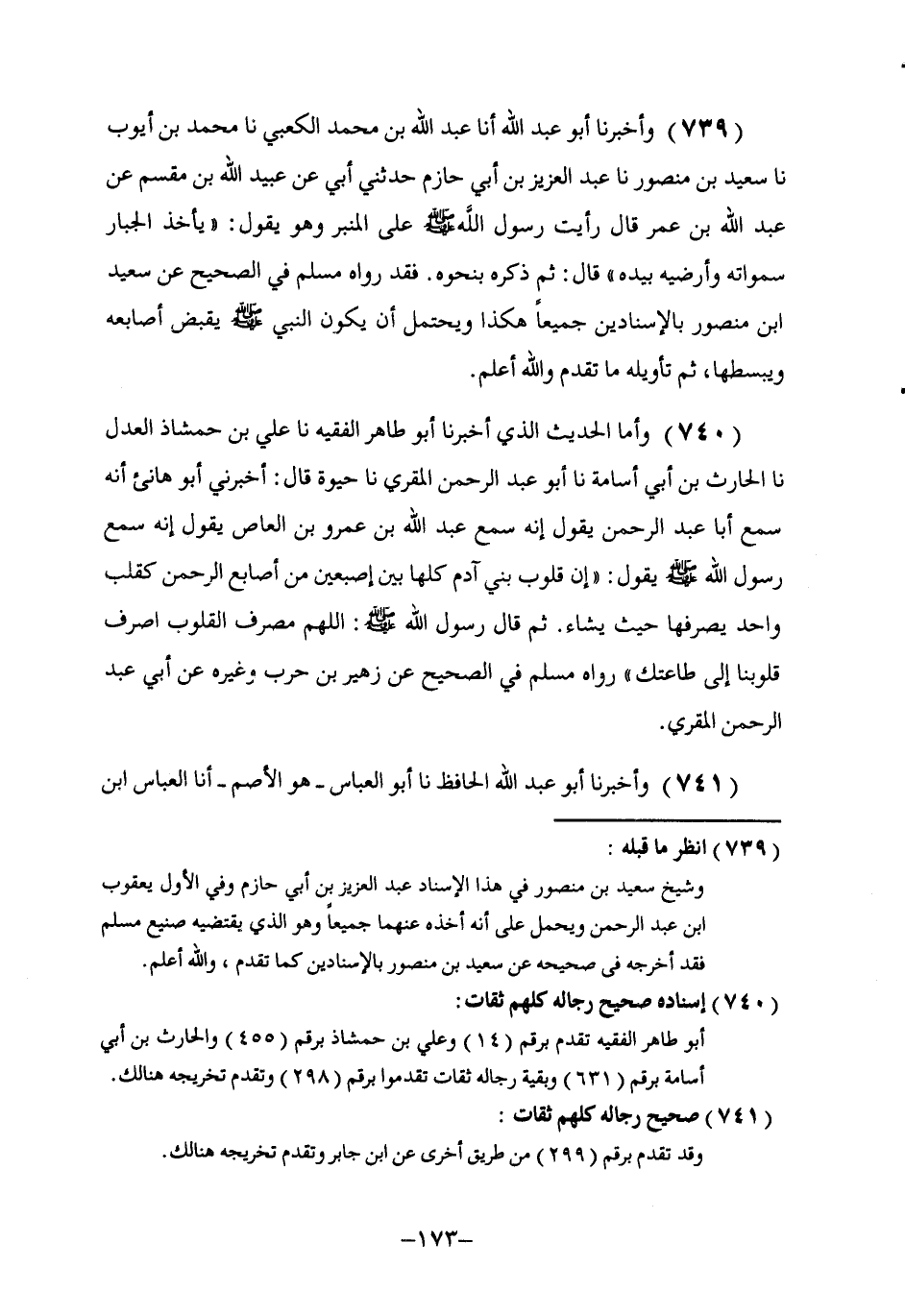740 - وَأَمَّا الْحَدِيثُ الَّذِي أَخْبَرَنَا أَبُو طَاهِرٍ الْفَقِيهُ، نا عَلِيُّ بْنُ حَمْشَاذٍ الْعَدْلُ، نا الْحَارِثُ بْنُ أَبِي أُسَامَةَ، نا أَبُو عَبْدِ الرَّحْمَنِ الْمُقْرِئُ، نا حَيْوَةُ، قَالَ: أَخْبَرَنِي أَبُو هَانِئٍ، أَنَّهُ سَمِعَ أَبَا عَبْدِ الرَّحْمَنِ، يَقُولُ، إِنَّهُ سَمِعَ عَبْدَ اللَّهِ بْنَ عَمْرِو بْنِ الْعَاصِ، يَقُولُ، إِنَّهُ سَمِعَ رَسُولَ اللَّهِ صَلَّى اللهُ عَلَيْهِ وَسَلَّمَ يَقُولُ: «إِنَّ §قُلُوبَ بَنِي آدَمَ كُلَّهَا بَيْنَ إِصْبَعَيْنِ مِنْ أَصَابِعِ الرَّحْمَنِ كَقَلْبٍ وَاحِدٍ يُصَرِّفُهَا حَيْثُ يَشَاءُ» . ثُمَّ قَالَ رَسُولُ اللَّهِ صَلَّى اللهُ عَلَيْهِ وَسَلَّمَ: «اللَّهُمَّ مُصَرِّفَ الْقُلُوبِ اصْرِفْ قُلُوبَنَا إِلَى طَاعَتِكَ» . رَوَاهُ مُسْلِمٌ فِي الصَّحِيحِ عَنْ زُهَيْرِ بْنِ حَرْبٍ وَغَيْرِهِ، عَنْ أَبِي عَبْدِ الرَّحْمَنِ الْمُقْرِئِ