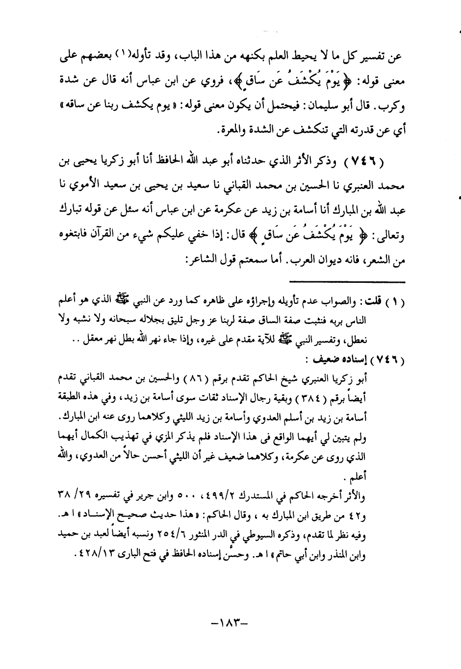 746 - وَذَكَرَ الْأَثَرَ الَّذِي حَدَّثَنَاهُ أَبُو عَبْدِ اللَّهِ الْحَافِظُ، أنا أَبُو زَكَرِيَّا يَحْيَى بْنُ مُحَمَّدٍ الْعَنْبَرِيُّ، نا الْحُسَيْنُ بْنُ مُحَمَّدٍ الْقَبَّانِيُّ، نا سَعِيدُ بْنُ يَحْيَى بْنِ سَعِيدٍ الْأُمَوِيُّ، نا عَبْدُ اللَّهِ بْنُ الْمُبَارَكِ، أنا أُسَامَةُ بْنُ زَيْدٍ، عَنْ عِكْرِمَةَ، عَنِ ابْنِ عَبَّاسٍ، أَنَّهُ سُئِلَ عَنْ قَوْلِهِ تَبَارَكَ وَتَعَالَى: {يَوْمَ يُكْشَفُ عَنْ سَاقٍ} [القلم: 42] قَالَ: §إِذَا خُفِيَ عَلَيْكُمْ شَيْءٌ مِنَ الْقُرْآنِ، فَابْتَغُوهُ مِنَ الشِّعْرِ، فَإِنَّهُ دِيوَانُ الْعَرَبِ. أَمَا سَمِعْتُمْ قَوْلَ الشَّاعِرِ: