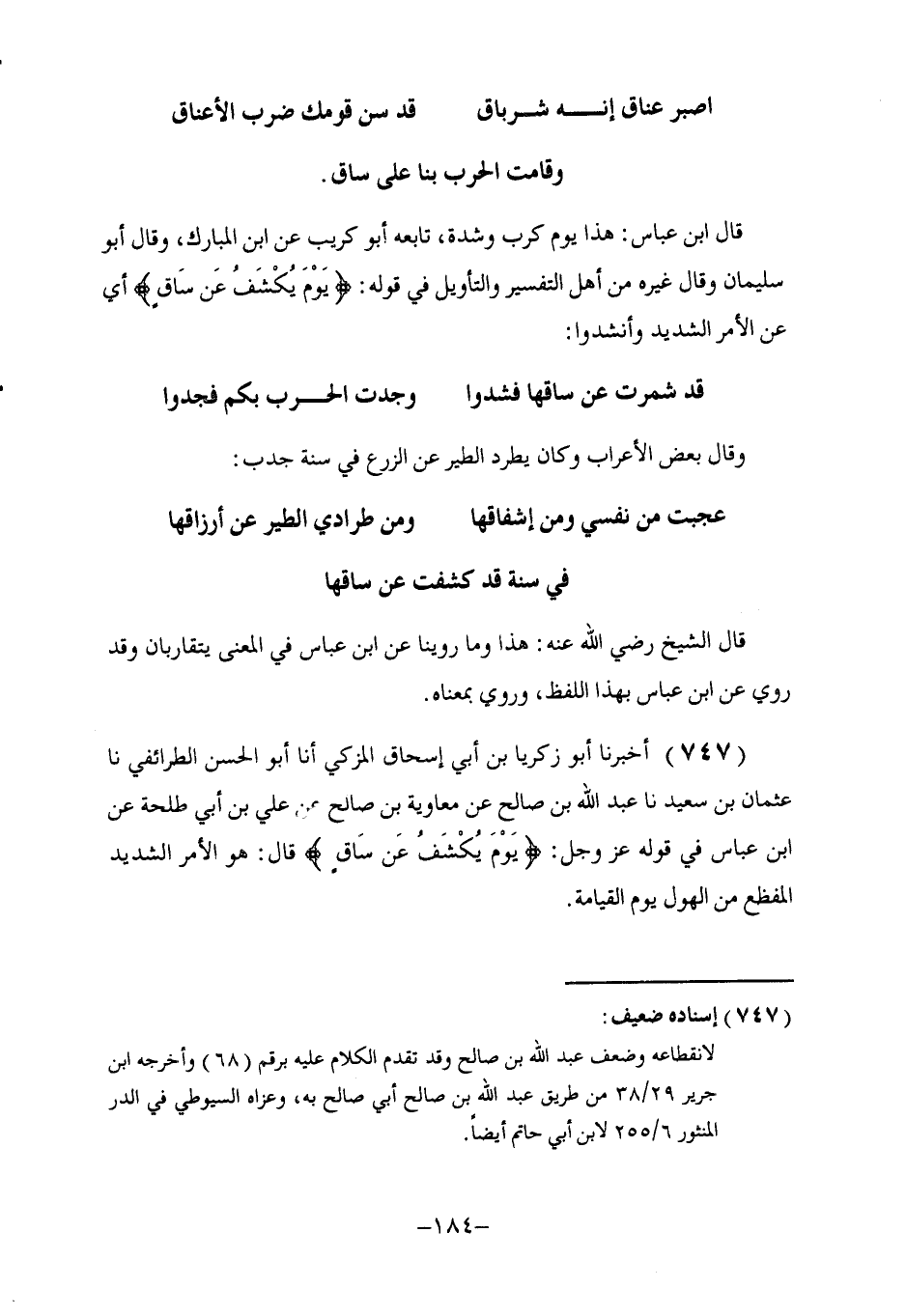 747 - أَخْبَرَنَا أَبُو زَكَرِيَّا بْنُ أَبِي إِسْحَاقَ الْمُزَكِّي، أنا أَبُو الْحَسَنِ الطَّرَائِفِيُّ، نا عُثْمَانُ بْنُ سَعِيدٍ، نا عَبْدُ اللَّهِ بْنُ صَالِحٍ، عَنْ مُعَاوِيَةَ بْنِ صَالِحٍ، عَنْ عَلِيِّ بْنِ أَبِي طَلْحَةَ، عنِ ابْنِ عَبَّاسٍ، فِي قَوْلِهِ عَزَّ وَجَلَّ: {§يَوْمَ يُكْشَفُ عَنْ سَاقٍ} [القلم: 42] قَالَ: هُوَ الْأَمْرُ الشَّدِيدُ الْمُفْظِعُ مِنَ الْهَوْلِ يَوْمَ الْقِيَامَة -[185]- ِ