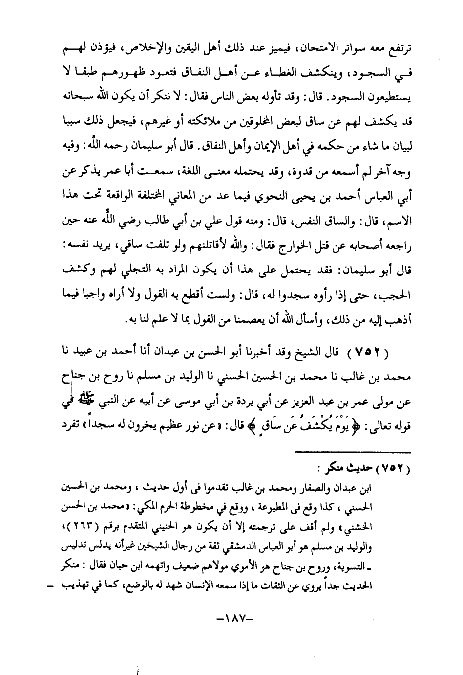 752 - وَقَدْ أَخْبَرَنَا أَبُو الْحَسَنِ بْنُ عَبْدَانَ، أنا أَحْمَدُ بْنُ عُبَيْدٍ، نا مُحَمَّدُ بْنُ غَالِبٍ، نا مُحَمَّدُ بْنُ الْحُسَيْنِ الْحَسَنِيُّ، نا الْوَلِيدُ بْنُ مُسْلِمٍ، نا رَوْحُ بْنُ جُنَاحٍ، عَنْ مَوْلَى، عُمَرَ بْنِ عَبْدِ الْعَزِيزِ عَنْ أَبِي بُرْدَةَ بْنِ أَبِي مُوسَى، عَنْ أَبِيهِ، عَنِ النَّبِيِّ صَلَّى اللهُ عَلَيْهِ وَسَلَّمَ فِي قَوْلِهِ تَعَالَى: {§يَوْمَ يُكْشَفُ عَنْ سَاقٍ} [القلم: 42] قَالَ: «عَنْ نُورٍ عَظِيمٍ يَخِرُّونَ لَهُ سُجَّدًا» . تَفَرَّدَ -[188]- بِهِ رَوْحُ بْنُ جُنَاحٍ، وَهُوَ شَامِيُّ يَأْتِي بِأَحَادِيثَ مُنْكَرَةٍ لَا يُتَابَعُ عَلَيْهَا وَاللَّهُ أَعْلَمُ. وَمَوَالِي عُمَرُ بْنُ عَبْدِ الْعَزِيزِ فِيهِمْ كَثْرَةٌ