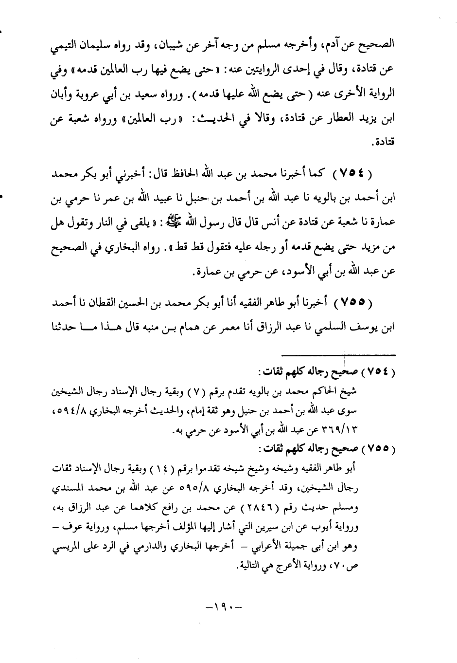 754 - كَمَا أَخْبَرَنَا مُحَمَّدُ بْنُ عَبْدِ اللَّهِ الْحَافِظُ، قَالَ: أَخْبَرَنِي أَبُو بَكْرٍ مُحَمَّدُ بْنُ أَحْمَدَ بْنِ بَالَوَيْهِ، نا عَبْدُ اللَّهِ بْنُ أَحْمَدَ بْنِ حَنْبَلٍ، نا عُبَيْدُ اللَّهِ بْنُ عُمَرَ، نا حَرَمِيُّ بْنُ عُمَارَةَ، نا شُعْبَةُ، عَنْ قَتَادَةَ، عَنْ أَنَسٍ، قَالَ: قَالَ رَسُولُ اللَّهِ صَلَّى اللهُ عَلَيْهِ وَسَلَّمَ: " §يُلْقَى فِي النَّارِ وَتَقُولُ: هَلْ مِنْ مَزِيدٍ حَتَّى يَضَعَ قَدَمَهُ أَوْ رِجْلَهُ عَلَيْهِ فَتَقُولُ قَطْ قَطْ ". رَوَاهُ الْبُخَارِيُّ فِي الصَّحِيحِ عَنْ عَبْدِ اللَّهِ بْنِ أَبِي الْأَسْوَدِ، عَنْ حَرَمِيِّ بْنِ عُمَارَةَ