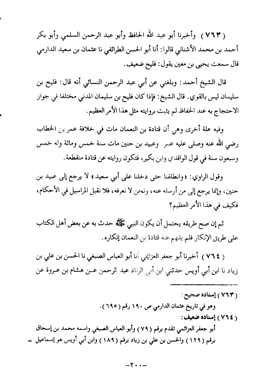 764 - أَخْبَرَنَا أَبُو جَعْفَرٍ الْعَزَايِمِيُّ، أنا أَبُو الْعَبَّاسِ الصِّبْغِيُّ، نا الْحَسَنُ بْنُ عَلِيِّ بْنِ زِيَادِ، نا ابْنِ أَبِي أُوَيْسٍ، حَدَّثَنِي ابْنُ أَبِي الزِّنَادِ عَبْدُ الرَّحْمَنِ، عَنْ هِشَامِ بْنِ عُرْوَةَ، عَنْ -[201]- عَبْدِ اللَّهِ بْنِ عُرْوَةَ بْنِ الزُّبَيْرِ، أَنَّ الزُّبَيْرَ بْنَ الْعَوَّامِ سَمِعَ رَجُلًا يُحَدِّثُ حَدِيثًا عَنِ النَّبِيِّ صَلَّى اللهُ عَلَيْهِ وَسَلَّمَ، فَاسْتَمَعَ الزُّبَيْرُ لَهُ حَتَّى إِذَا قَضَى الرَّجُلُ حَدِيثَهُ قَالَ لَهُ الزُّبَيْرُ: أَنْتَ سَمِعْتَ هَذَا مِنْ رَسُولِ اللَّهِ صَلَّى اللهُ عَلَيْهِ وَسَلَّمَ؟ فَقَالَ الرَّجُلُ: نَعَمْ. قَالَ: هَذَا وَأَشْبَاهُهُ مِمَّا يَمْنَعُنَا أَنْ نُحَدِّثَ عَنِ النَّبِيِّ صَلَّى اللهُ عَلَيْهِ وَسَلَّمَ، قَدْ لَعَمْرِي سَمِعْتُ هَذَا مِنْ رَسُولِ اللَّهِ صَلَّى اللهُ عَلَيْهِ وَسَلَّمَ وَأَنَا يَوْمَئِذٍ حَاضِرٌ، وَلَكِنَّ رَسُولَ اللَّهِ صَلَّى اللهُ عَلَيْهِ وَسَلَّمَ ابْتَدَأَ هَذَا الْحَدِيثَ فَحَدَّثَنَاهُ عَنْ رَجُلٍ مِنْ أَهْلِ الْكِتَابِ حَدَّثَهُ إِيَّاهُ، §فَجِئْتَ أَنْتَ يَوْمَئِذٍ بَعْدَ أَنْ قَضَى صَدْرَ الْحَدِيثِ، وَذَكَرَ الرَّجُلَ الَّذِي مِنْ أَهْلِ الْكِتَابِ فَظَنَنْتَ أَنَّهُ مِنْ حَدِيثِ رَسُولِ اللَّهِ صَلَّى اللهُ عَلَيْهِ وَسَلَّمَ. قَالَ الشَّيْخُ: وَلِهَذَا الْوَجْهِ مِنَ الِاحْتِمَالِ تَرَكَ أَهْلُ النَّظَرِ مِنْ أَصْحَابِنَا الِاحْتِجَاجَ بِأَخْبَارِ الْآحَادِ فِي صِفَاتِ اللَّهِ تَعَالَى، إِذَا لَمْ يَكُنْ لِمَا انْفَرَدَ مِنْهَا أَصْلٌ فِي الْكِتَابِ أَوِ الْإِجْمَاعِ، وَاشْتَغَلُوا بِتَأْوِيلِهِ، وَمَا نُقِلَ فِي هَذَا الْخَبَرِ إِنَّمَا يَفْعَلُهُ فِي الشَّاهِدِ مِنَ الْفَارِغِينَ مِنْ أَعْمَالِهِمْ مَنْ مَسَّهُ لُغُوبٌ، أَوْ أَصَابَهُ نَصَبٌ مِمَّا فَعَلَ، لِيَسْتَرِيحَ بِالِاسْتِلْقَاءِ وَوَضَعِ إِحْدَى رِجْلَيْهِ عَلَى الْأُخْرَى، وَقَدْ كَذَّبَ اللَّهُ تَعَالَى الْيَهُودَ، حِينَ وَصَفُوهُ بِالِاسْتِرَاحَةِ بَعْدَ خَلَقِ السَّمَاوَاتِ وَالْأَرْضِ وَمَا بَيْنَهُمَا فَقَالَ: {وَلَقَدْ خَلَقْنَا السَّمَاوَاتِ وَالْأَرْضَ وَمَا بَيْنَهُمَا فِي سِتَّةِ أَيَّامٍ وَمَا مَسَّنَا مِنْ لُغُوبٍ فَاصْبِرْ عَلَى مَا يَقُولُونَ} [ق: 39]