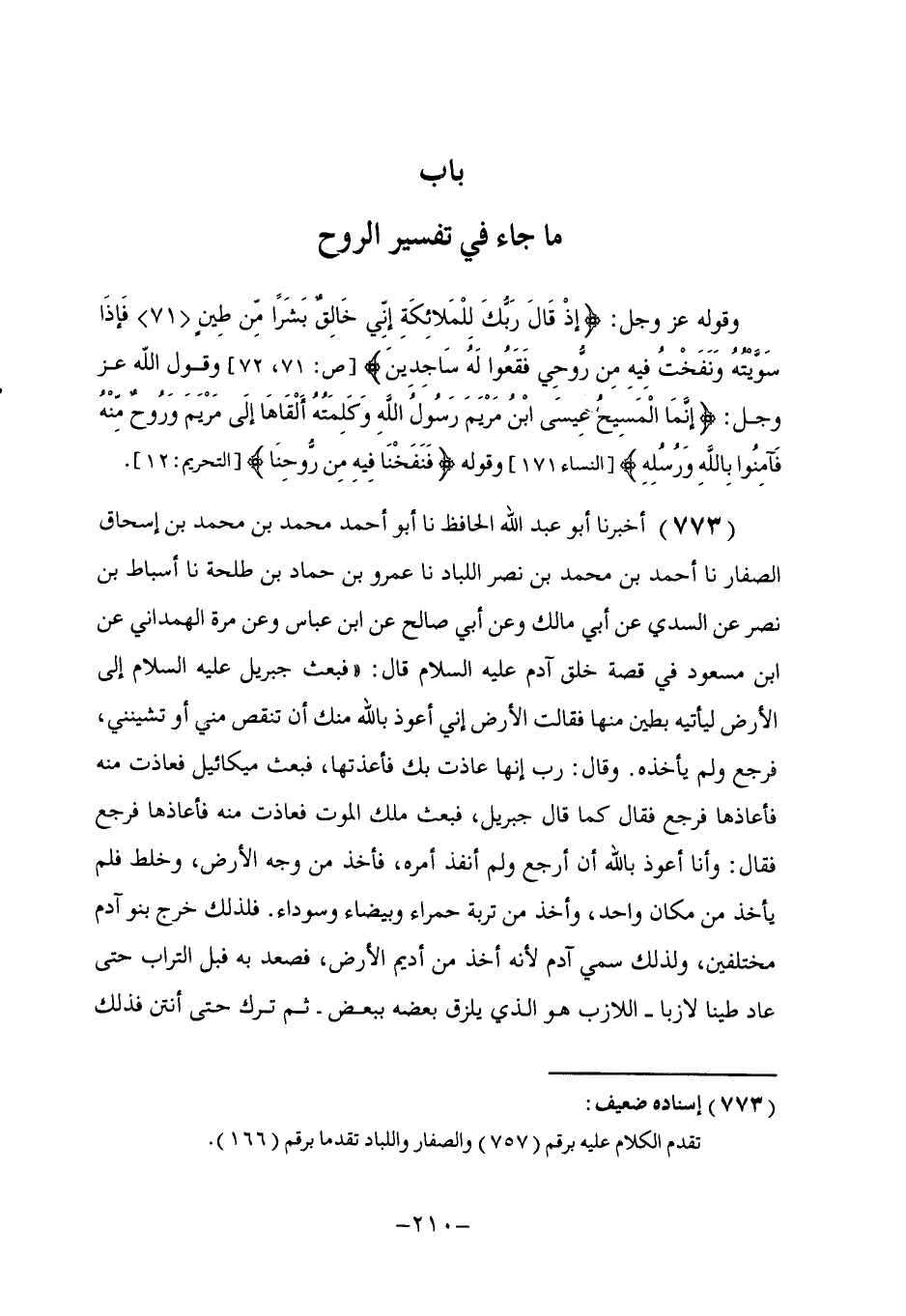 §بَابُ مَا جَاءَ فِي تَفْسِيرِ الرُّوحِ وَقَوْلِهِ عَزَّ وَجَلَّ: إِذْ قَالَ رَبُّكَ لِلْمَلَائِكَةِ إِنِّي خَالِقٌ بَشَرًا مِنْ طِينٍ فَإِذَا سَوَّيْتُهُ وَنَفَخْتُ فِيهِ مِنْ رُوحِي فَقَعُوا لَهُ سَاجِدِينَ، وَقَوْلِ اللَّهِ عَزَّ وَجَلَّ: إِنَّمَا الْمَسِيحُ عِيسَى ابْنُ مَرْيَمَ رَسُولُ اللَّهِ وَكَلِمَتُهُ أَلْقَاهَا إِلَى مَرْيَمَ وَرُوحٌ مِنْهُ فَآمِنُوا بِاللَّهِ وَرُسُلِهِ، وَقَوْلِهِ فَنَفَخْنَا فِيهِ مِنْ رُوحِنَا