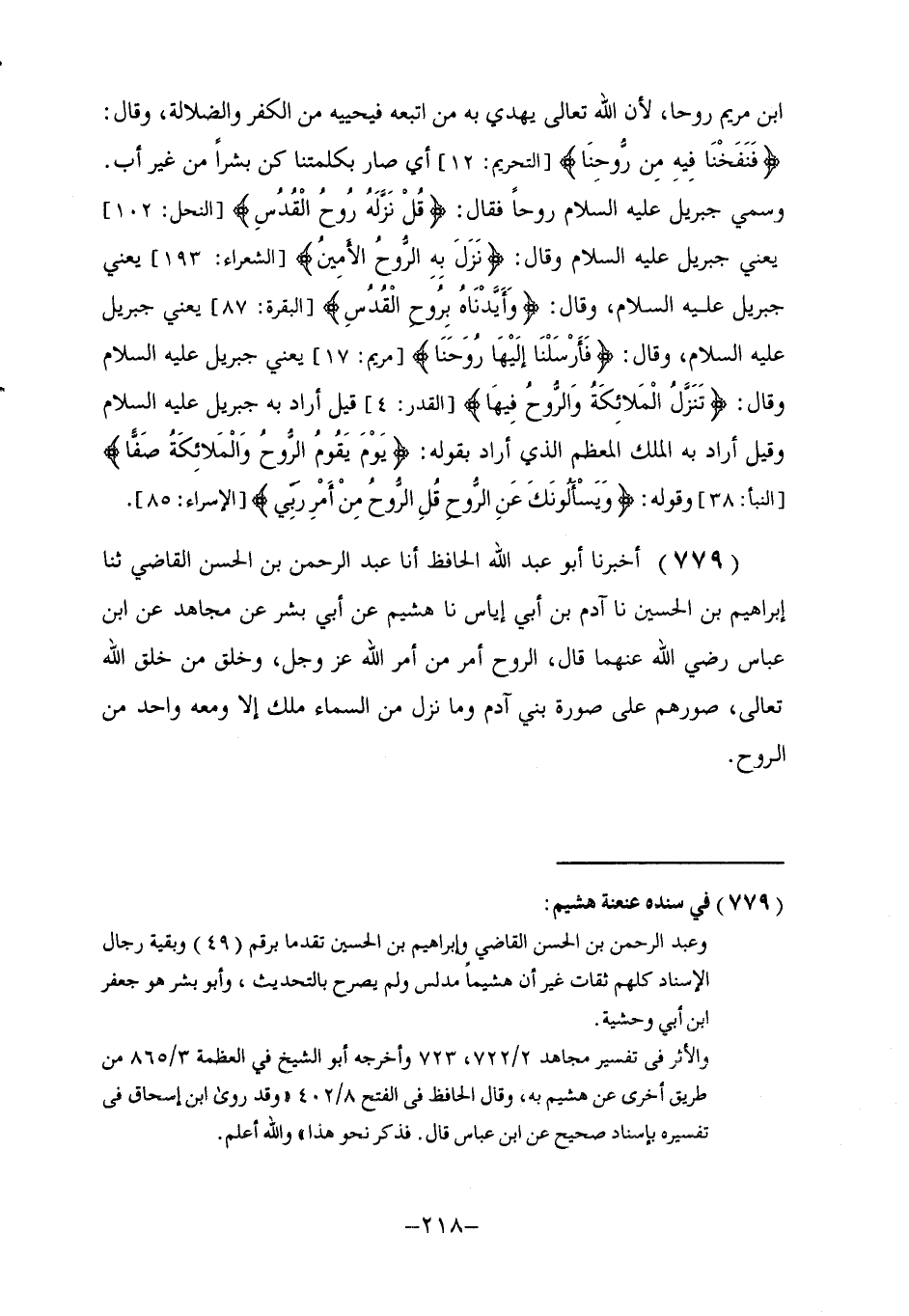 779 - أَخْبَرَنَا أَبُو عَبْدِ اللَّهِ الْحَافِظُ، أنا عَبْدُ الرَّحْمَنِ بْنُ الْحَسَنِ الْقَاضِي، ثنا إِبْرَاهِيمُ بْنُ الْحُسَيْنِ، نا آدَمُ بْنُ أَبِي إِيَاسَ، نا هُشَيْمٌ، عَنْ أَبِي بِشْرٍ، عَنْ مُجَاهِدٍ، عَنِ ابْنِ عَبَّاسٍ، رَضِيَ اللَّهُ عَنْهُمَا قَالَ: §الرُّوحُ أَمَرٌ مِنْ أَمَرِ اللَّهِ عَزَّ وَجَلَّ، وَخَلْقٌ مِنْ خَلْقِ اللَّهِ تَعَالَى، صُوَرُهُمْ عَلَى صُورَةِ بَنِي آدَمَ، وَمَا نَزَلَ مِنَ السَّمَاءِ مَلَكٌ إِلَّا وَمَعَهُ وَاحِدٌ مِنَ الرُّوحِ