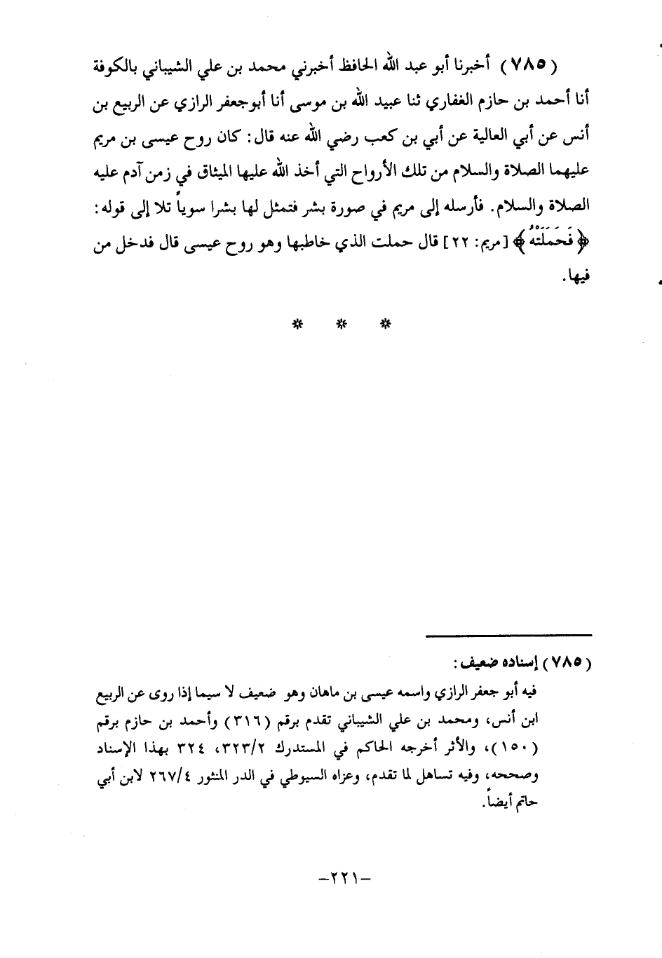 785 - أَخْبَرَنَا أَبُو عَبْدِ اللَّهِ الْحَافِظُ، أَخْبَرَنِي مُحَمَّدُ بْنُ عَلِيٍّ الشَّيْبَانِيُّ بِالْكُوفَةِ، أنا أَحْمَدُ بْنُ حَازِمٍ الْغِفَارِيُّ، ثنا عُبَيْدُ اللَّهِ بْنُ مُوسَى، أنا أَبُو جَعْفَرٍ الرَّازِيُّ، عَنِ الرَّبِيعِ بْنِ أَنَسٍ، عَنْ أَبِي الْعَالِيَةِ، عَنْ أُبَيِّ بْنِ كَعْبٍ، رَضِيَ اللَّهُ عَنْهُ، قَالَ: كَانَ §رُوحُ عِيسَى ابْنِ مَرْيَمَ عَلَيْهِمَا الصَّلَاةُ وَالسَّلَامُ مِنْ تِلْكَ الْأَرْوَاحِ الَّتِي أَخَذَ اللَّهُ عَلَيْهَا الْمِيثَاقَ فِي زَمَنِ آدَمَ عَلَيْهِ الصَّلَاةُ وَالسَّلَامُ، فَأَرْسَلَهُ إِلَى مَرْيَمَ فِي صُورَةِ بِشْرٍ، {فَتَمَثَّلَ لَهَا بَشَرًا سَوِيًّا} [مريم: 17] ، تَلَا إِلَى قَوْلِهِ: {فَحَمَلَتْهُ} [مريم: 22] " قَالَ: حَمَلَتِ الَّذِي خَاطَبَهَا، وَهُوَ رُوحُ عِيسَى، قَالَ: فَدَخَلَ مِنْ فِيهَا