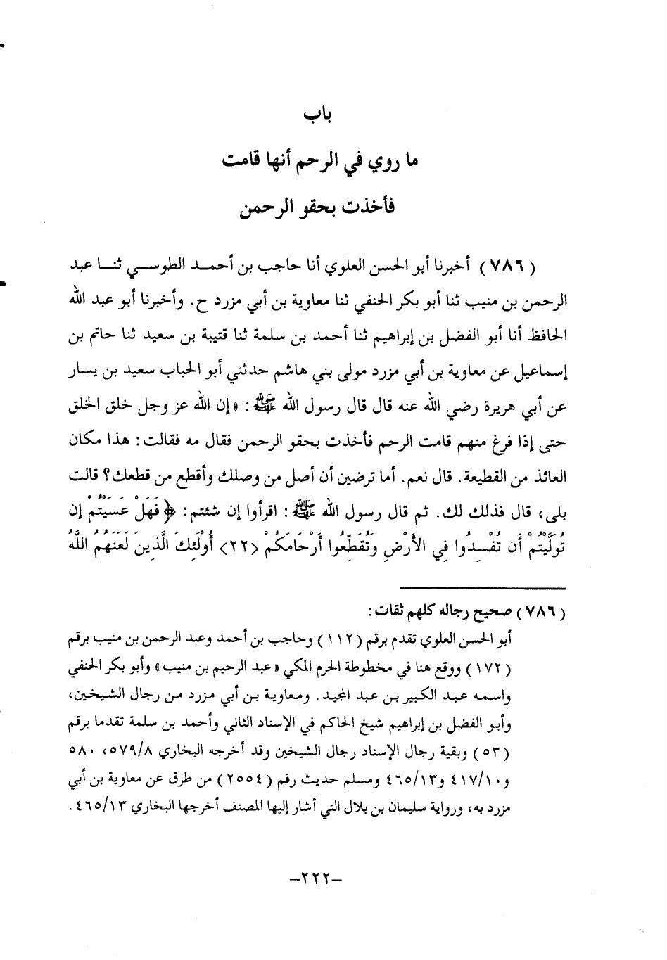 786 - أَخْبَرَنَا أَبُو الْحَسَنِ الْعَلَوِيُّ، أنا حَاجِبُ بْنُ أَحْمَدَ الطُّوسِيُّ، ثنا عَبْدُ الرَّحْمَنِ بْنُ مُنِيبٍ، ثنا أَبُو بَكْرٍ الْحَنَفِيُّ، ثنا مُعَاوِيَةُ بْنُ أَبِي مُزَرِّدٍ، ح. وَأَخْبَرَنَا أَبُو عَبْدِ اللَّهِ الْحَافِظُ، أنا أَبُو الْفَضْلِ بْنُ إِبْرَاهِيمَ، ثنا أَحْمَدُ بْنُ سَلَمَةَ، ثنا قُتَيْبَةُ بْنُ سَعِيدٍ، ثنا حَاتِمُ بْنُ إِسْمَاعِيلَ، عَنْ مُعَاوِيَةَ بْنِ أَبِي مُزَرِّدٍ، مَوْلَى بَنِي هَاشِمٍ، حَدَّثَنِي أَبُو الْحُبَابِ سَعِيدُ بْنُ يَسَارٍ، عَنْ أَبِي هُرَيْرَةَ، رَضِيَ اللَّهُ عَنْهُ قَالَ: قَالَ رَسُولُ اللَّهِ صَلَّى اللهُ عَلَيْهِ وَسَلَّمَ: " إِنَّ اللَّهَ عَزَّ وَجَلَّ خَلَقَ الْخَلْقَ حَتَّى إِذَا فَرَغَ مِنْهُمْ §قَامَتِ الرَّحِمُ فَأَخَذَتْ بِحَقْوِ الرَّحْمَنِ، فَقَالَ: مَهْ، فَقَالَتْ: هَذَا مَكَانُ الْعَائِذِ مِنَ الْقَطِيعَةِ. قَالَ: نَعَمْ. أَمَا تَرْضَيْنَ أَنْ أَصِلَ مَنْ وَصَلَكِ وَأَقْطَعَ مَنْ قَطَعَكِ؟ قَالَتْ: بَلَى، قَالَ: فَذَلِكَ لَكِ. ثُمَّ قَالَ رَسُولُ اللَّهِ صَلَّى اللهُ عَلَيْهِ وَسَلَّمَ: اقْرَأُوا إِنْ شِئْتُمْ: {فَهَلْ عَسَيْتُمْ إِنْ تَوَلَّيْتُمْ أَنْ تُفْسِدُوا فِي الْأَرْضِ وَتُقَطِّعُوا أَرْحَامَكُمْ، أُولَئِكَ الَّذِينَ لَعَنَهُمُ اللَّهُ -[223]- فَأَصَمَّهُمْ وَأَعْمَى أَبْصَارَهُمْ أَفَلَا يَتَدَبَّرُونَ الْقُرْآنَ أُمْ عَلَى قُلُوبٍ أَقْفَالُهَا} [محمد: 23] . رَوَاهُ الْبُخَارِيُّ فِي الصَّحِيحِ عَنْ إِبْرَاهِيمَ بْنِ حَمْزَةَ، وَرَوَاهُ مُسْلِمٌ عَنْ قُتَيْبَةَ عَنْ حَاتِمٍ، وَرَوَاهُ سُلَيْمَانُ بْنُ بِلَالٍ، عَنْ مُعَاوِيَةَ بْنِ أَبِي مُزَرِّدٍ فَقَالَ: «فَأَخَذَتْ بِحَقْوِ الرَّحْمَنِ» . وَمَعْنَاهُ عِنْدَ أَهْلِ النَّظَرِ: أَنَّهَا اسْتَجَارَتْ وَاعْتَصَمَتْ بِاللَّهِ عَزَّ وَجَلَّ، كَمَا تَقُولُ الْعَرَبُ: تَعَلَّقْتُ بِظِلِّ جَنَاحِهِ. أَيِ: اعْتَصَمْتُ بِهِ. وَقِيلَ: الْحَقْوُ الْإِزَارُ، وَإِزَارُهُ عِزَّةٌ، بِمَعْنَى أَنَّهُ مَوْصُوفٌ بِالْعِزِّ، فَلَاذَتِ الرَّحِمُ بِعِزِّهِ مِنَ الْقَطِيعَةِ وَعَاذَتْ بِهِ. وَقَدْ رَوَاهُ مُعَاوِيَةُ بْنُ أَبِي مُزَرِّدٍ عَنْ يَزِيدَ بْنِ رُومَانَ، عَنْ عُرْوَةَ، عَنْ عَائِشَةَ رَضِيَ اللَّهُ عَنْهَا قَالَتْ: قَالَ رَسُولُ اللَّهِ صَلَّى اللهُ عَلَيْهِ وَسَلَّمَ: " إِنَّ الرَّحِمَ مُعَلَّقَةٌ بِالْعَرْشِ تَقُولُ: مَنْ وَصَلَنِي وَصَلَهُ اللَّهُ، وَمَنْ قَطَعَنِي قَطَعَهُ اللَّهُ ".